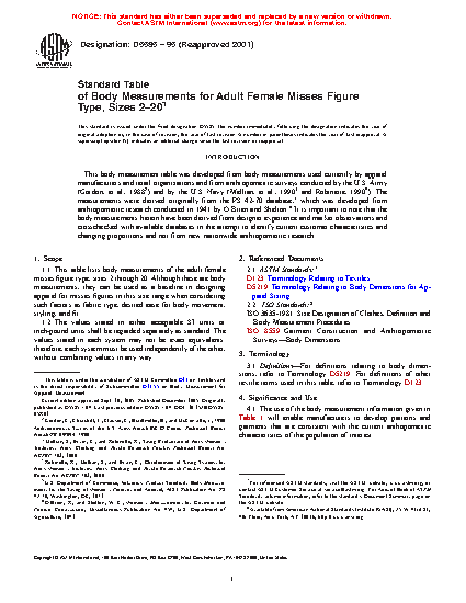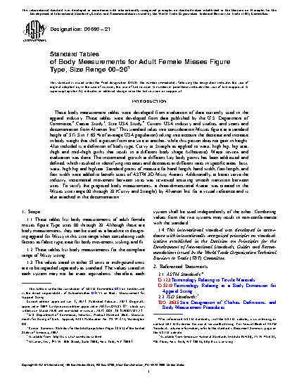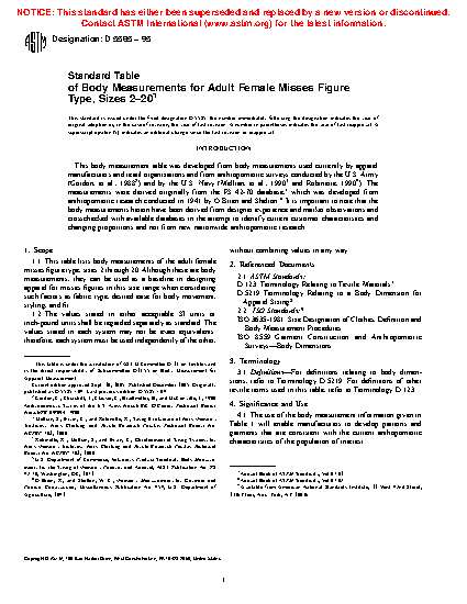 1.1 These tables list body measurements of adult female misses figure Type sizes 00 through 20. Although these are body measurements, they can be used as a baseline in designing apparel for Missy in this size range when considering such factors as fabric type, ease for body movement, styling, and fit.