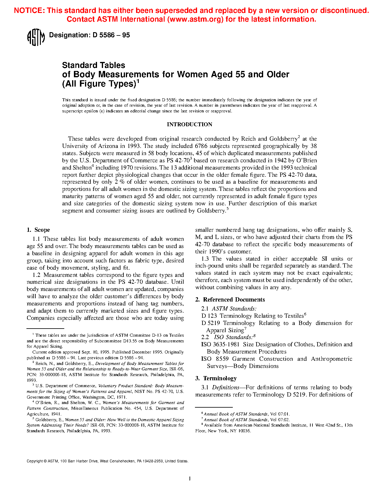 1.1 This document represents research methodology and the tables represent charted data from subjects. Some terminology is specific to the research. The data represent the first body measurements ever taken of women aged 55 and older and is not a standard of average current apparel industry practices as represented in all other sizing standards.