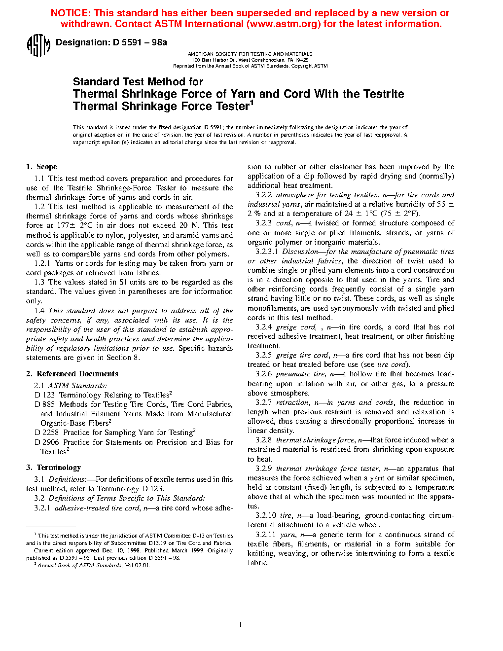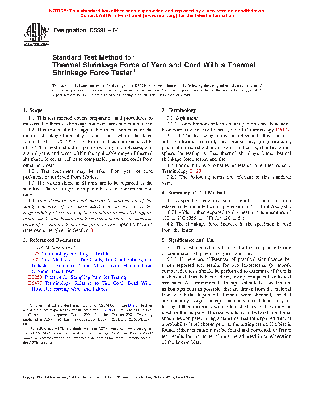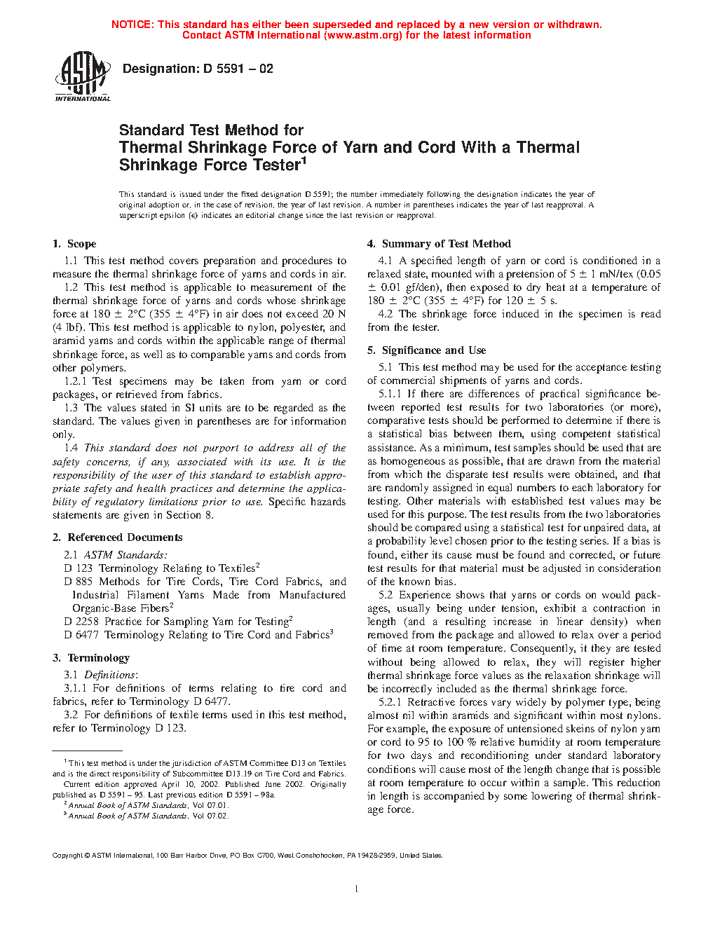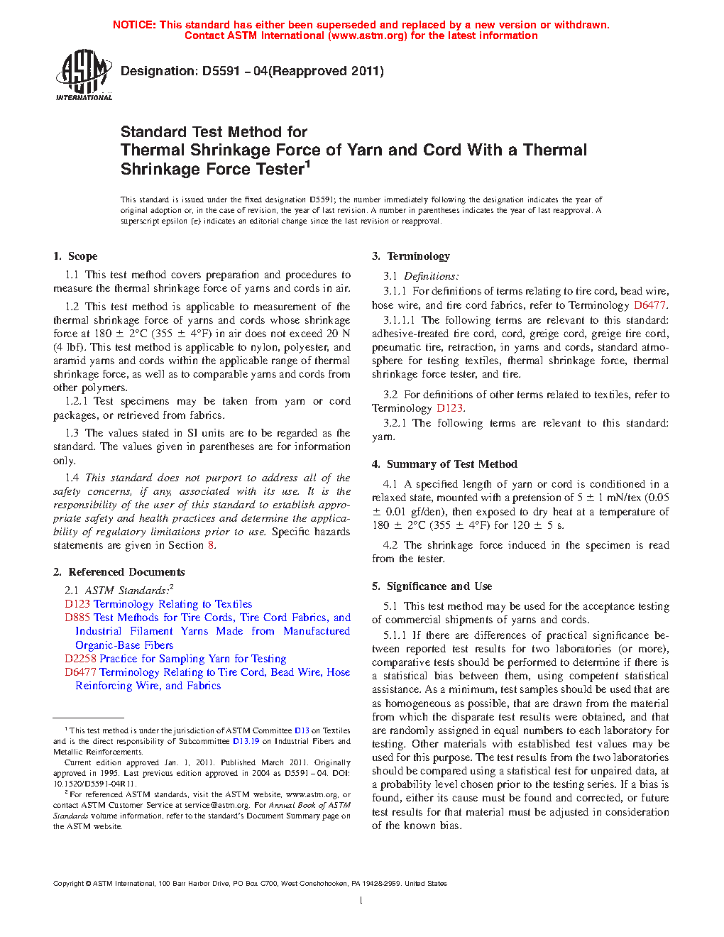 5.6 This test method is in agreement with the nominal procedures of Test Methods D885/D885M for the determination of thermal shrinkage force in yarns and cords.