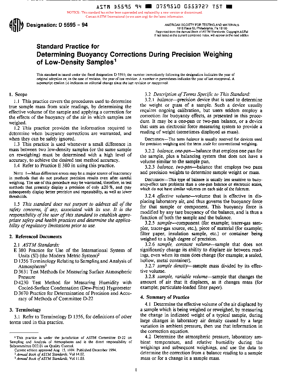 Standard Practice for Determining Buoyancy Corrections During Precision Weighing of Low-Density Samples (Withdrawn 1997)