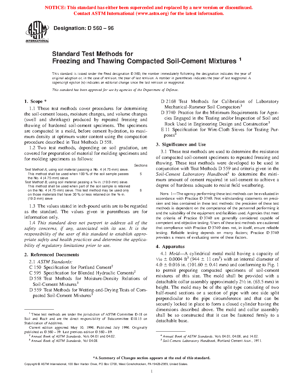 These test methods are used to determine the resistance of compacted soil-cement specimens to repeated freezing and thawing. These test methods were developed to be used in conjunction with Test Methods D 559