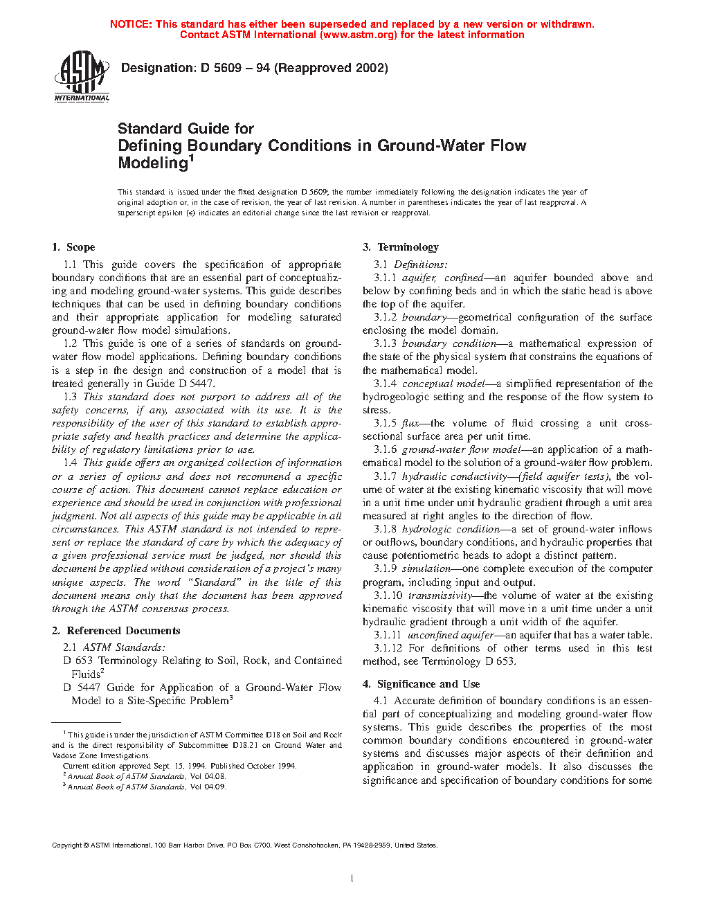 4.1 Accurate definition of boundary conditions is an important part of conceptualizing and modeling groundwater flow systems. This guide describes the properties of the most common boundary conditions encountered in groundwater systems and discusses major aspects of their definition and application in groundwater models. It also discusses the significance and specification of boundary conditions for some field situations and some common errors in specifying boundary conditions in groundwater models.