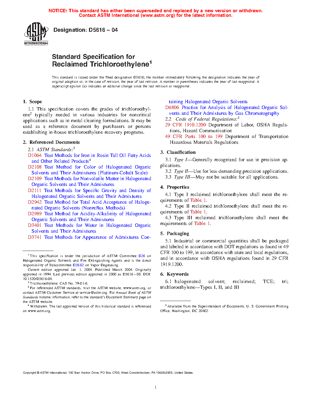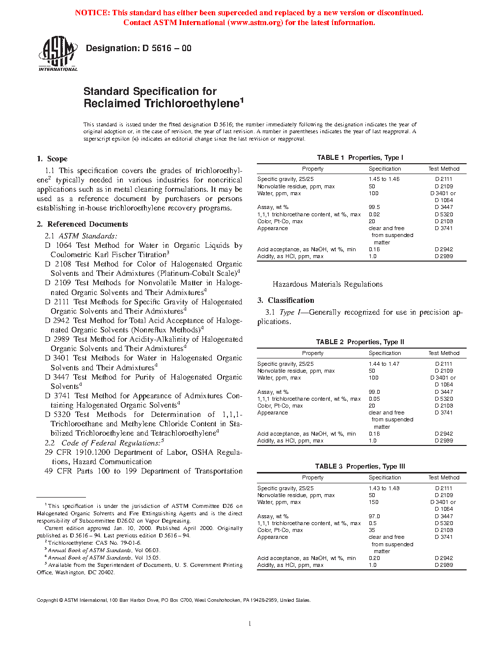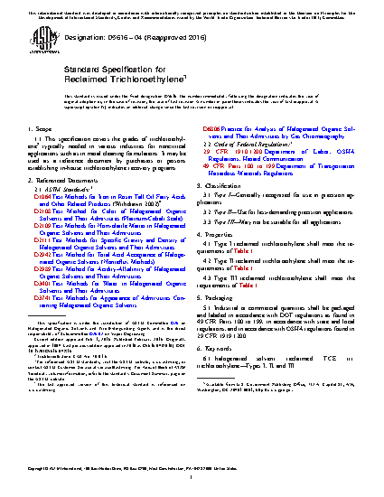 This specification covers the grades of trichloroethylene typically needed in various industries for noncritical applications such as in metal cleaning formulations. It may also be used as a reference document by purchasers or persons establishing in-house trichloroethylene recovery programs. The specimens are classified into three types: Type I – generally recognized for use in precision applications; Type II – for use in less-demanding precision applications; and Type III – may not be suitable for all applications. The three types of reclaimed trichloroethylene shall meet the specific gravity, nonvolatile residue, water content, assay percentage, 1,1,1 trichloroethane content, color in platinum-cobalt scale, appearance, acid acceptance, and acidity requirements.