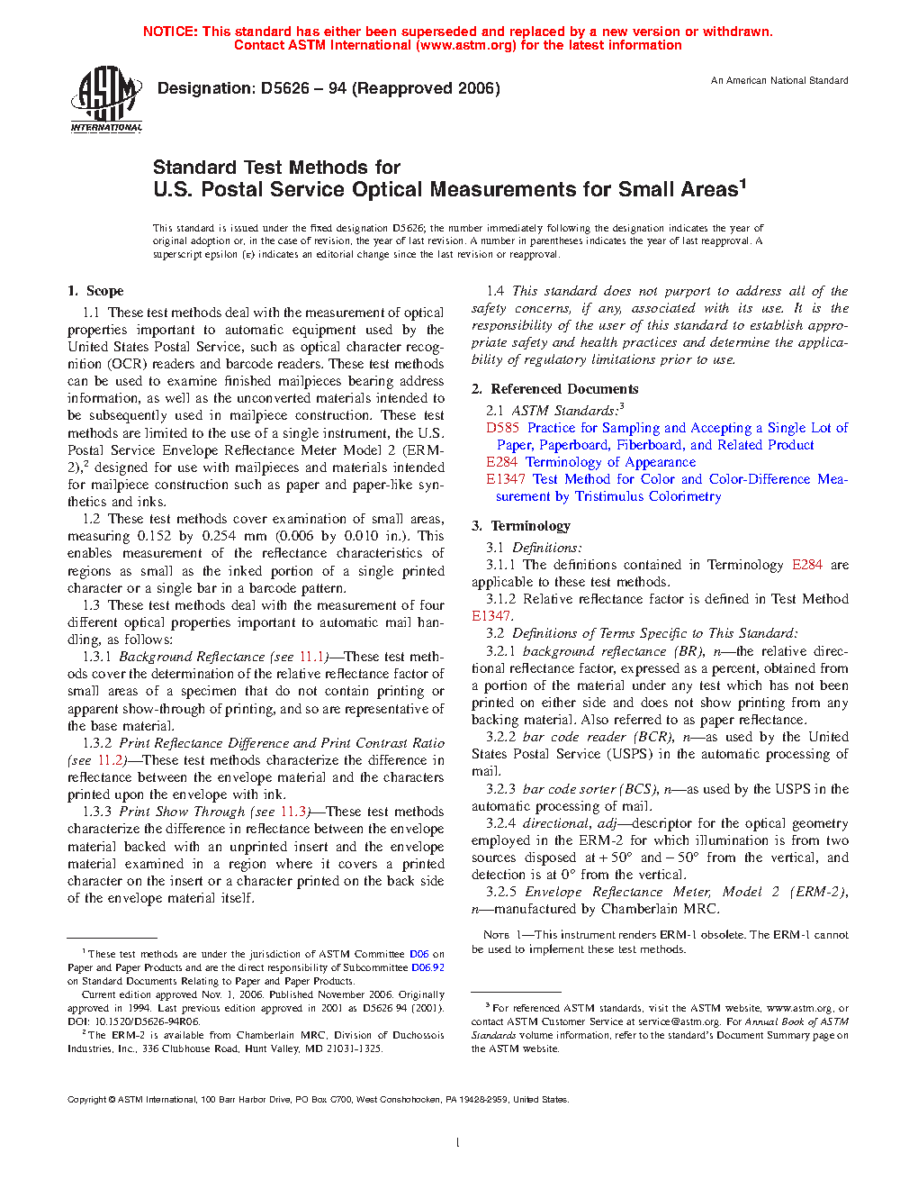 1.1 These test methods deal with the measurement of optical properties important to automatic equipment used by the United States Postal Service, such as optical character recognition (OCR) readers and barcode readers. These test methods can be used to examine finished mailpieces bearing address information, as well as the unconverted materials intended to be subsequently used in mailpiece construction. These test methods are limited to the use of a single instrument, the U.S. Postal Service Envelope Reflectance Meter Model 2 (ERM-2), designed for use with mailpieces and materials intended for mailpiece construction such as paper and paper-like synthetics and inks.