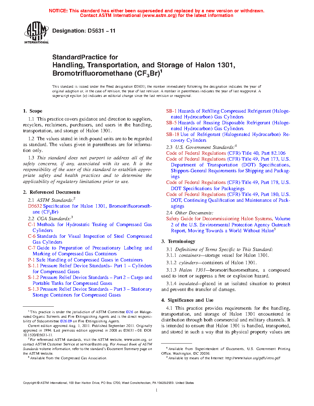 4.1 This practice provides requirements for the handling, transportation, and storage of Halon 1301 encountered in distribution through both commercial and military channels. It is intended to ensure that Halon 1301 is handled, transported, and stored in such a way that its physical property values are not degraded. Transport may be by various means, such as, but not limited to, highway, rail, water, and air.