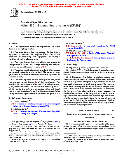 1.1 This specification covers the requirements for Halon 1301 as a fire-fighting medium.