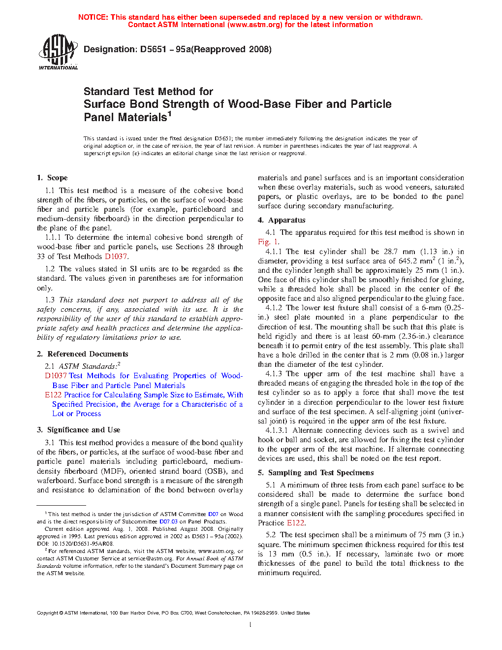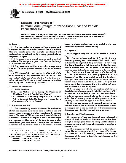 1.1 This test method is a measure of the cohesive bond strength of the fibers, or particles, on the surface of wood-base fiber and particle panels (for example, particleboard and medium-density fiberboard) in the direction perpendicular to the plane of the panel.