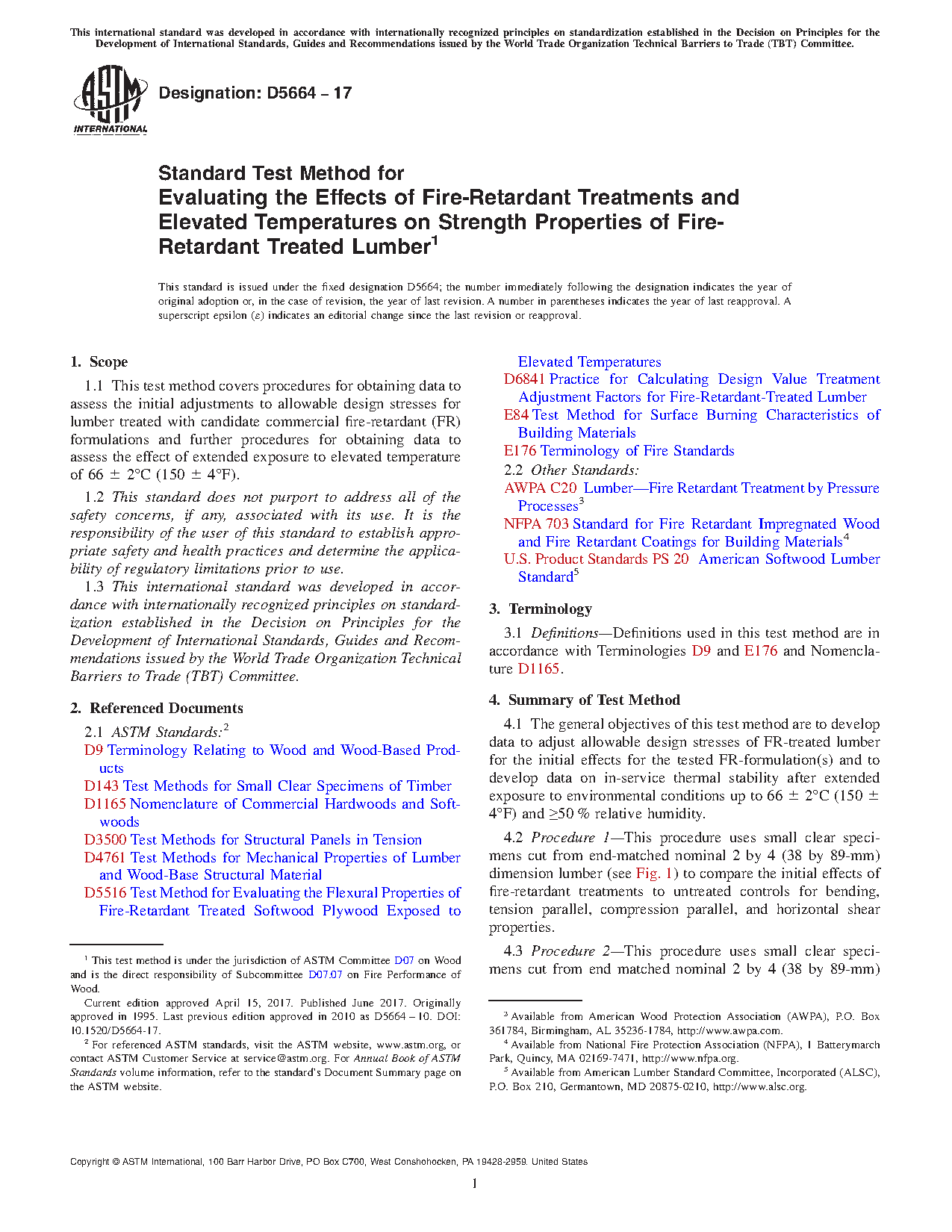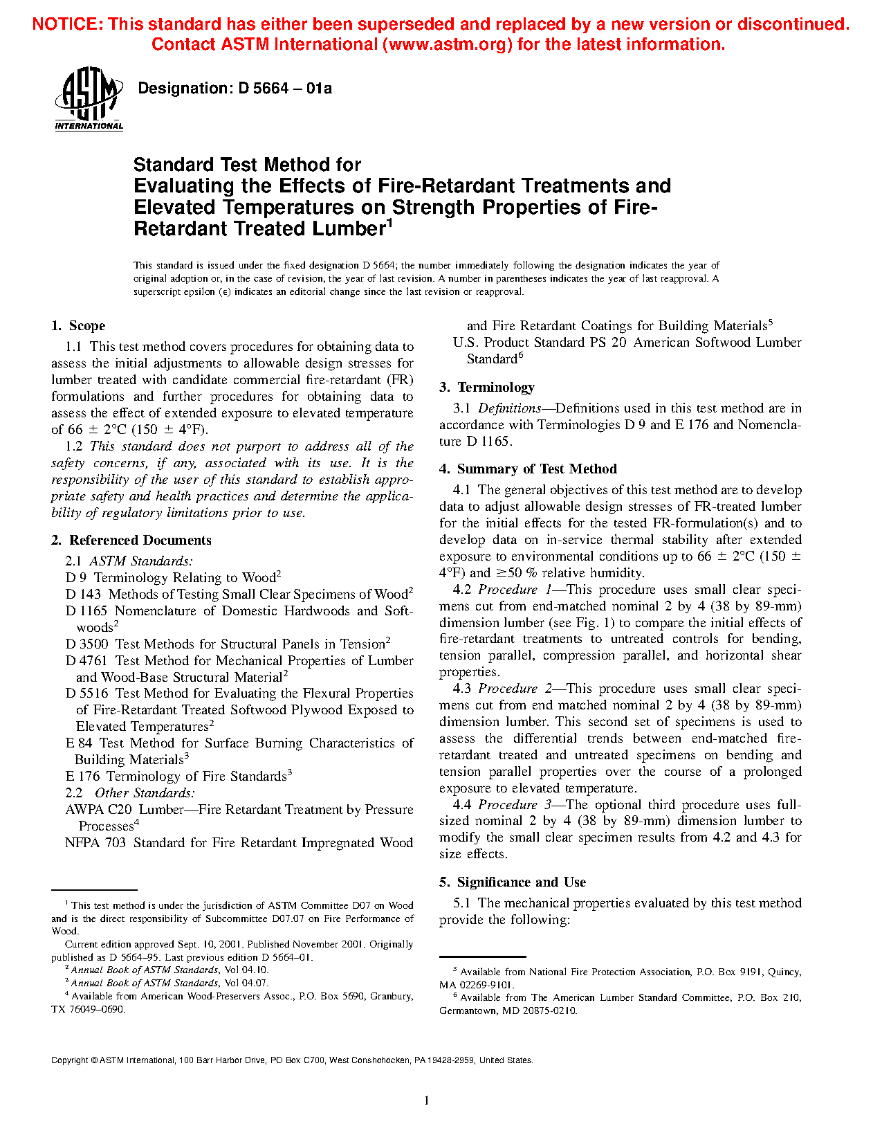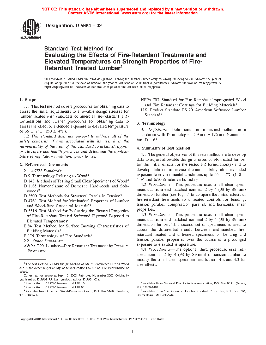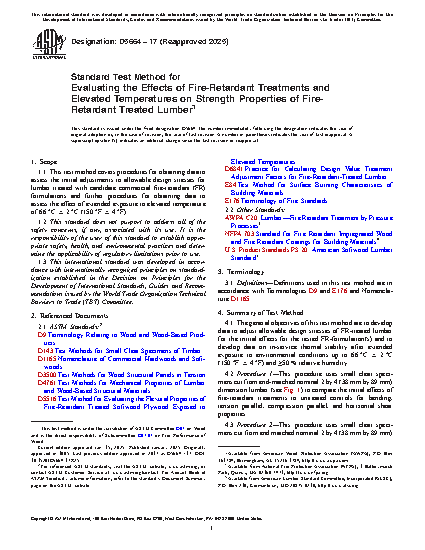 1.1 This test method covers procedures for obtaining data to assess the initial adjustments to allowable design stresses for lumber treated with candidate commercial fire-retardant (FR) formulations and further procedures for obtaining data to assess the effect of extended exposure to elevated temperature of 66 ± 2oC (150 ± 4oF).