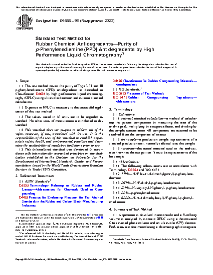 1.1 This test method covers the purity of Type I, II, and III p-phenylenediamine (PPD) antidegradants as described in Classification D4676 by high performance liquid chromatography (HPLC) using ultraviolet detection and external standard calculations.