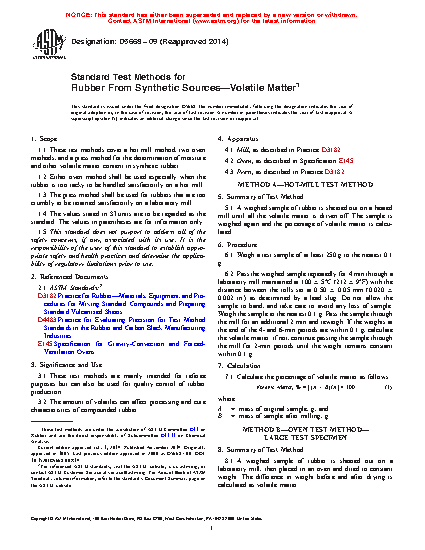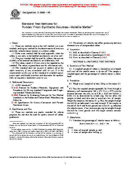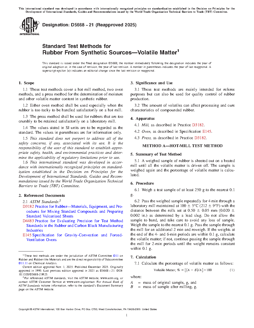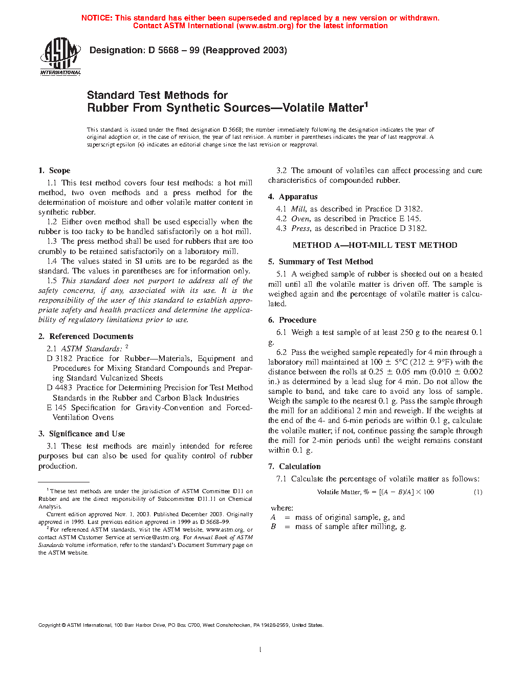 1.1 This standard covers four test methods: a hot mill method, two oven methods and a press method for the determination of moisture and other volatile matter content in synthetic rubber.