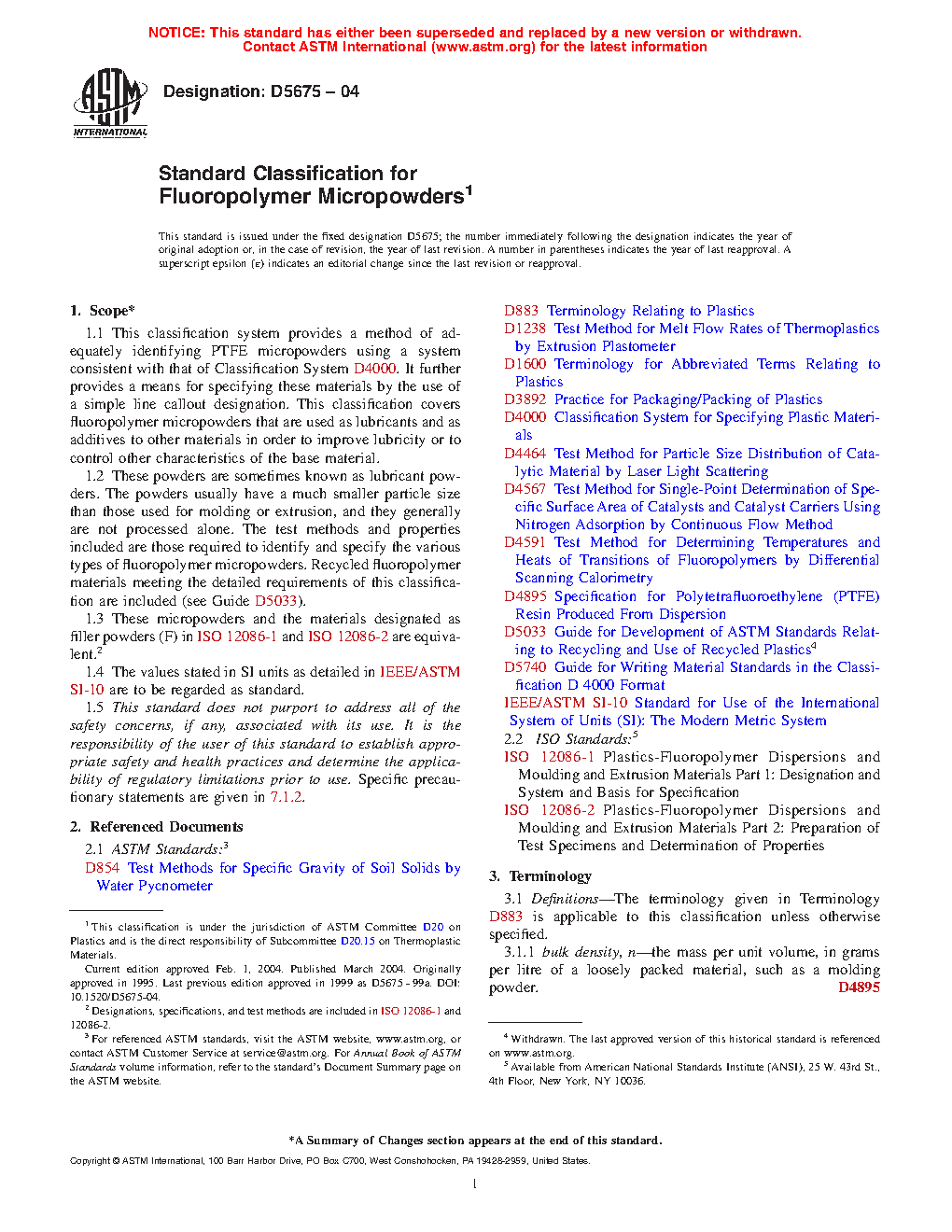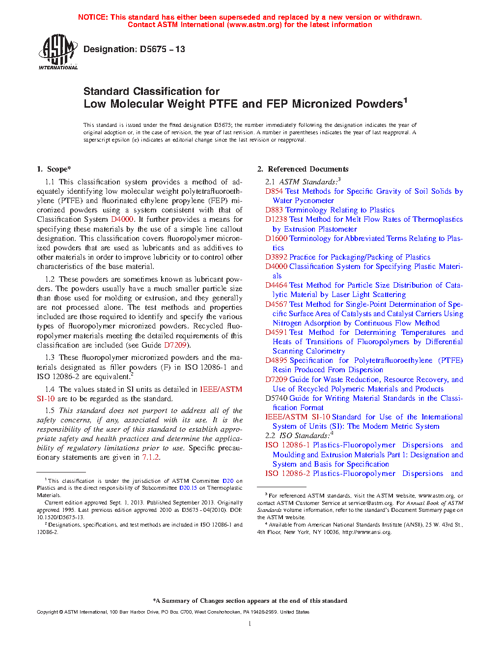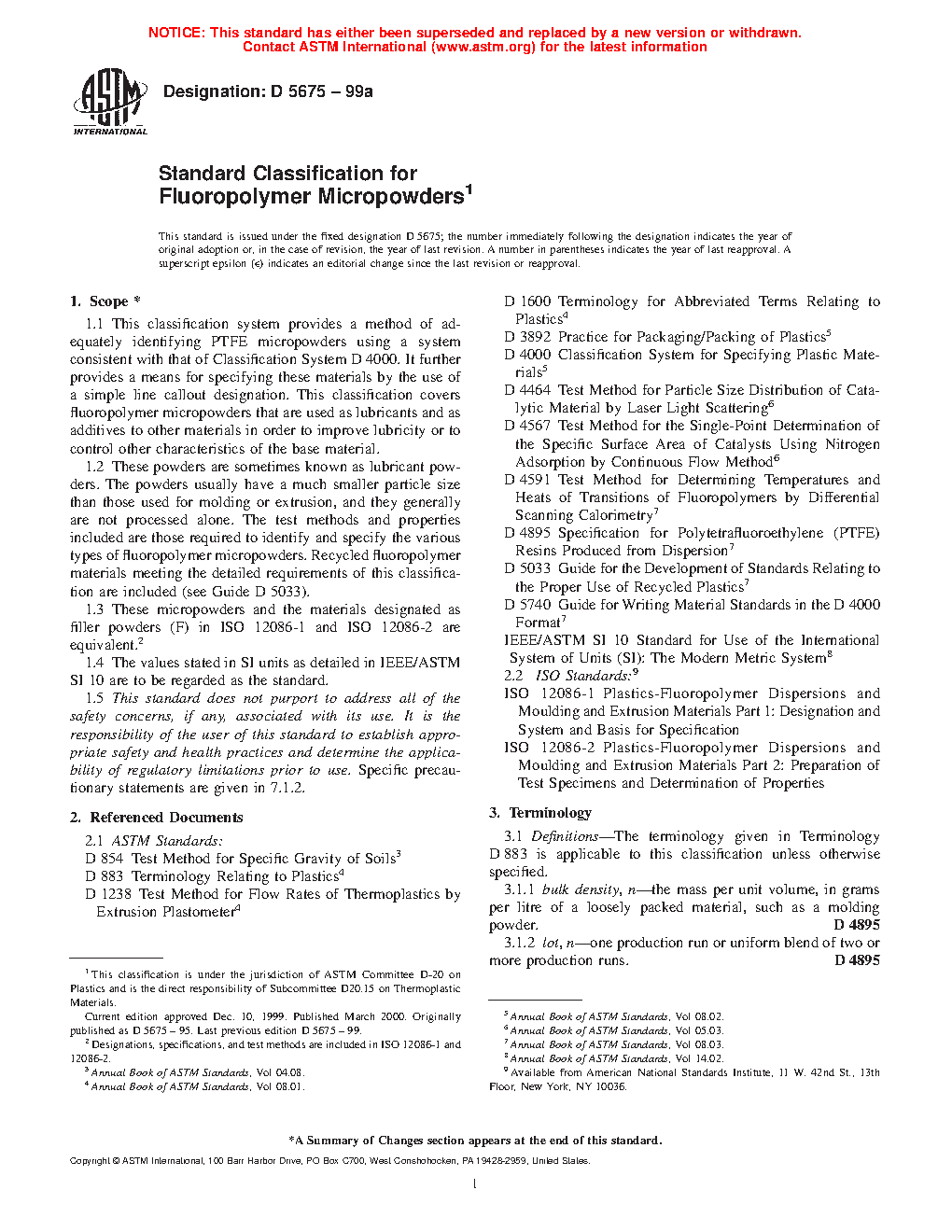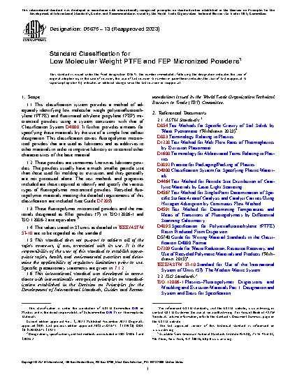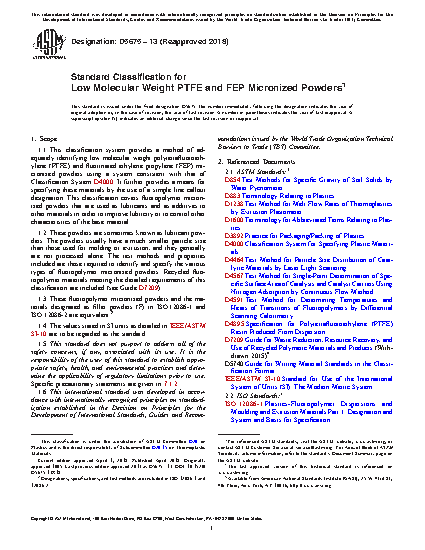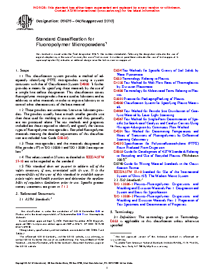 1.2 These powders are sometimes known as lubricant powders. The powders usually have a much smaller particle size than those used for molding or extrusion, and they generally are not processed alone. The test methods and properties included are those required to identify and specify the various types of fluoropolymer micropowders. Recycled fluoropolymer materials meeting the detailed requirements of this classification are included (see Guide D5033).