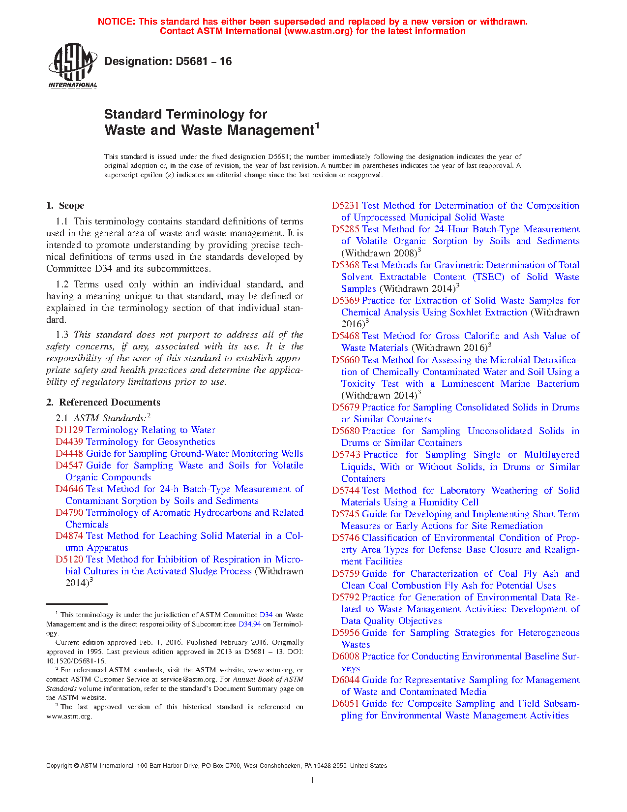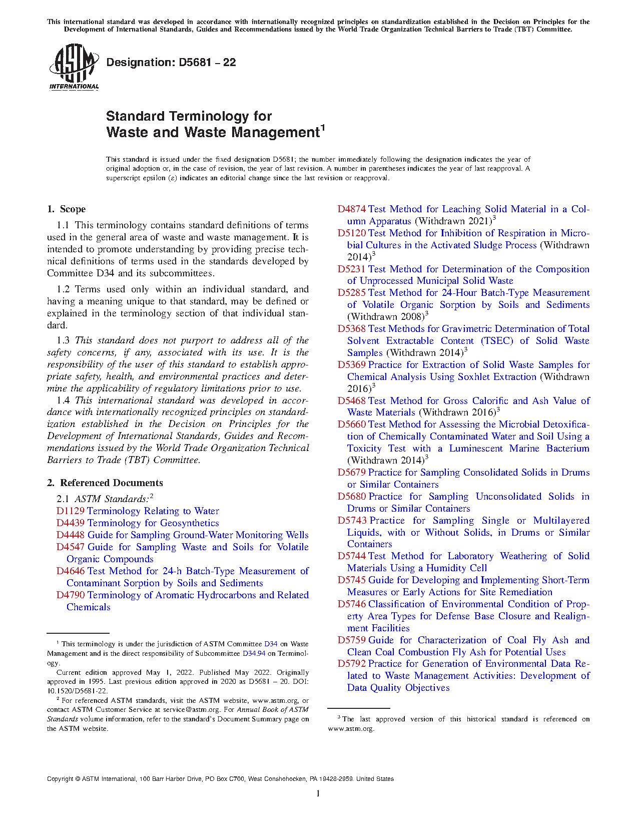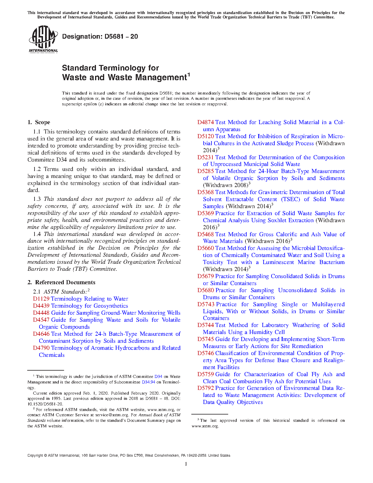 This terminology is not intended for subjects other than waste and waste management. For terms applicable to other subject areas, the appropriate terminology standard(s) should be consulted. See the current edition of the Compilation of ASTM Standard Definitions and the list of terminology standards cited therein.