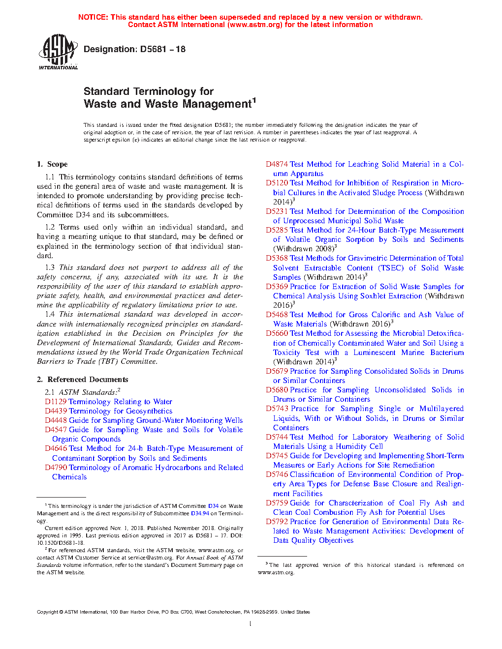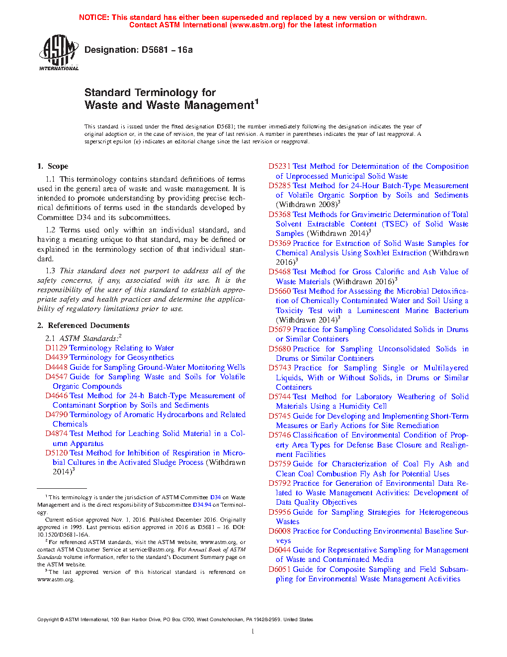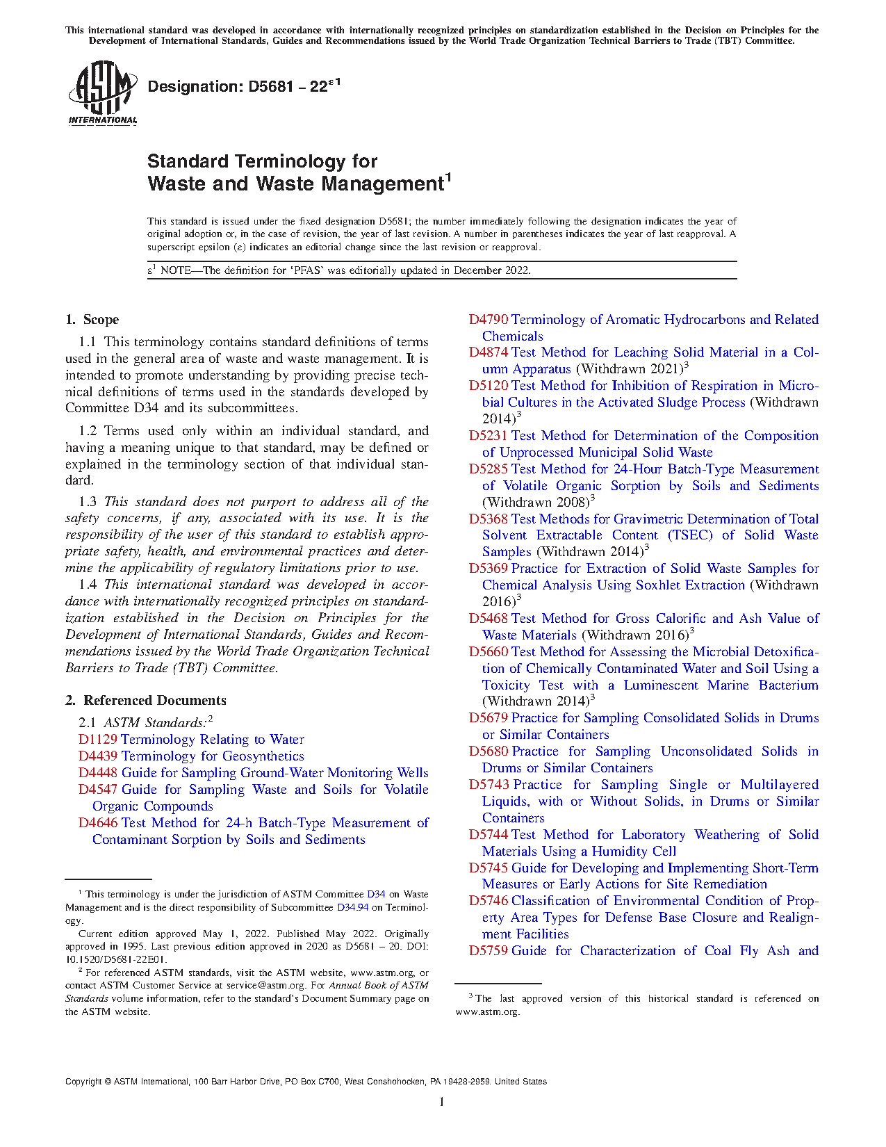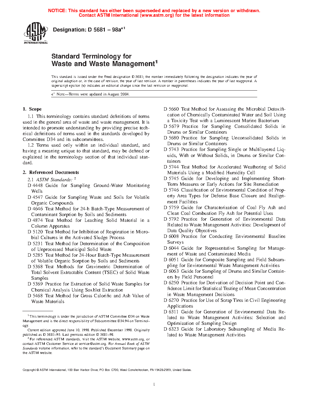 This terminology is not intended for subjects other than waste and waste management. For terms applicable to other subject areas, the appropriate terminology standard(s) should be consulted. See the current edition of the Compilation of ASTM Standard Definitions and the list of terminology standards cited therein.