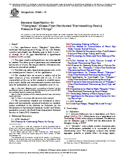 1.1 This specification covers “fiberglass” (glass-fiber-reinforced thermosetting-resin) fittings for use with filament wound or centrifugally cast fiberglass pipe, or both, in sizes 1 in. through 24 in. for pipe manufactured to Specification D2996 or D2997, or both.