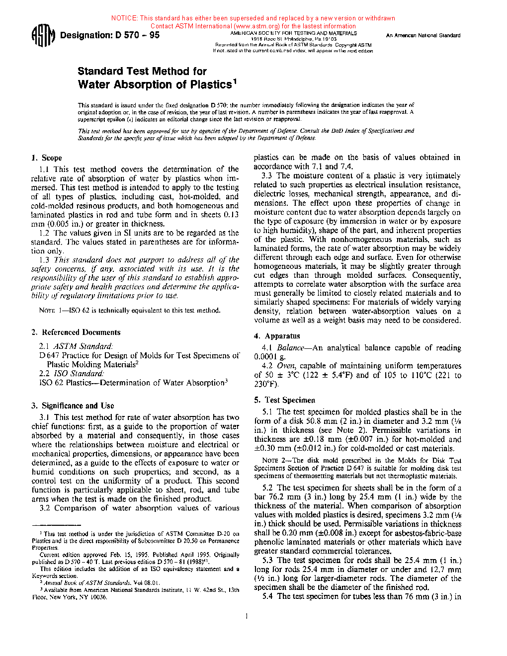 Note 1: This test method and ISO 62 are technically equivalent when the test specimen described in 6.2 is used.