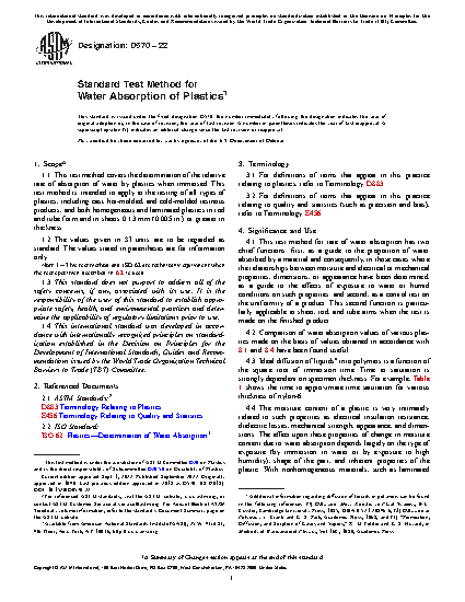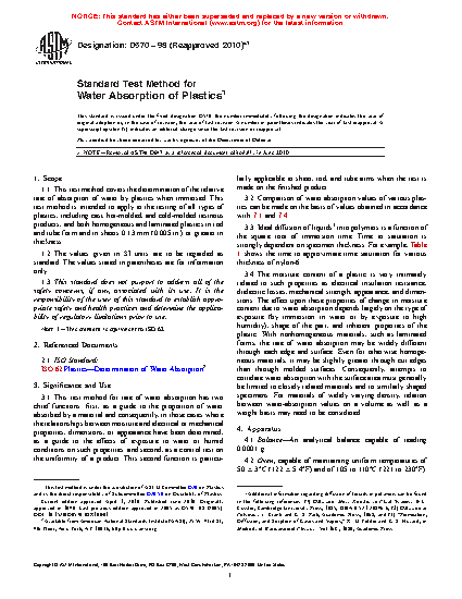 1.1 This test method covers the determination of the relative rate of absorption of water by plastics when immersed. This test method is intended to apply to the testing of all types of plastics, including cast, hot-molded, and cold-molded resinous products, and both homogeneous and laminated plastics in rod and tube form and in sheets 0.13 mm (0.005 in.) or greater in thickness.