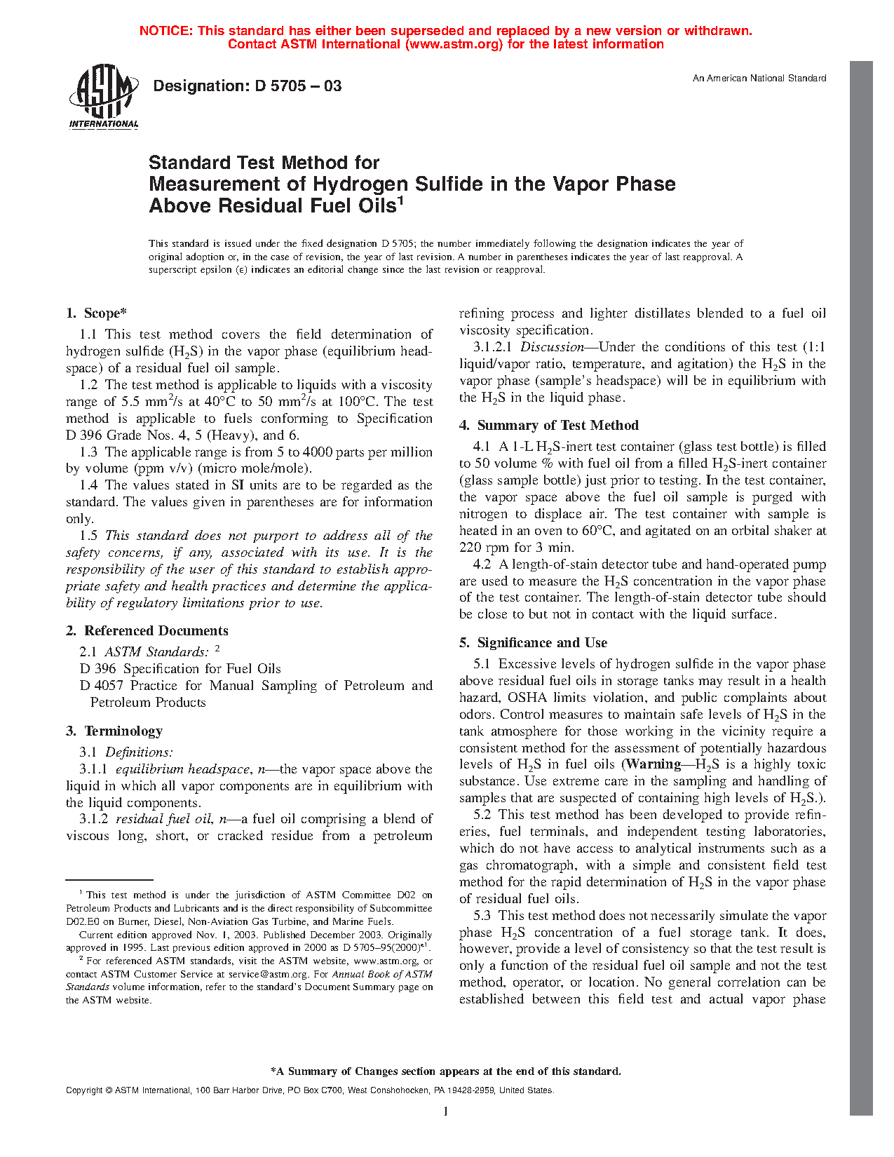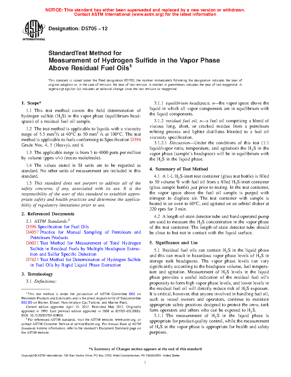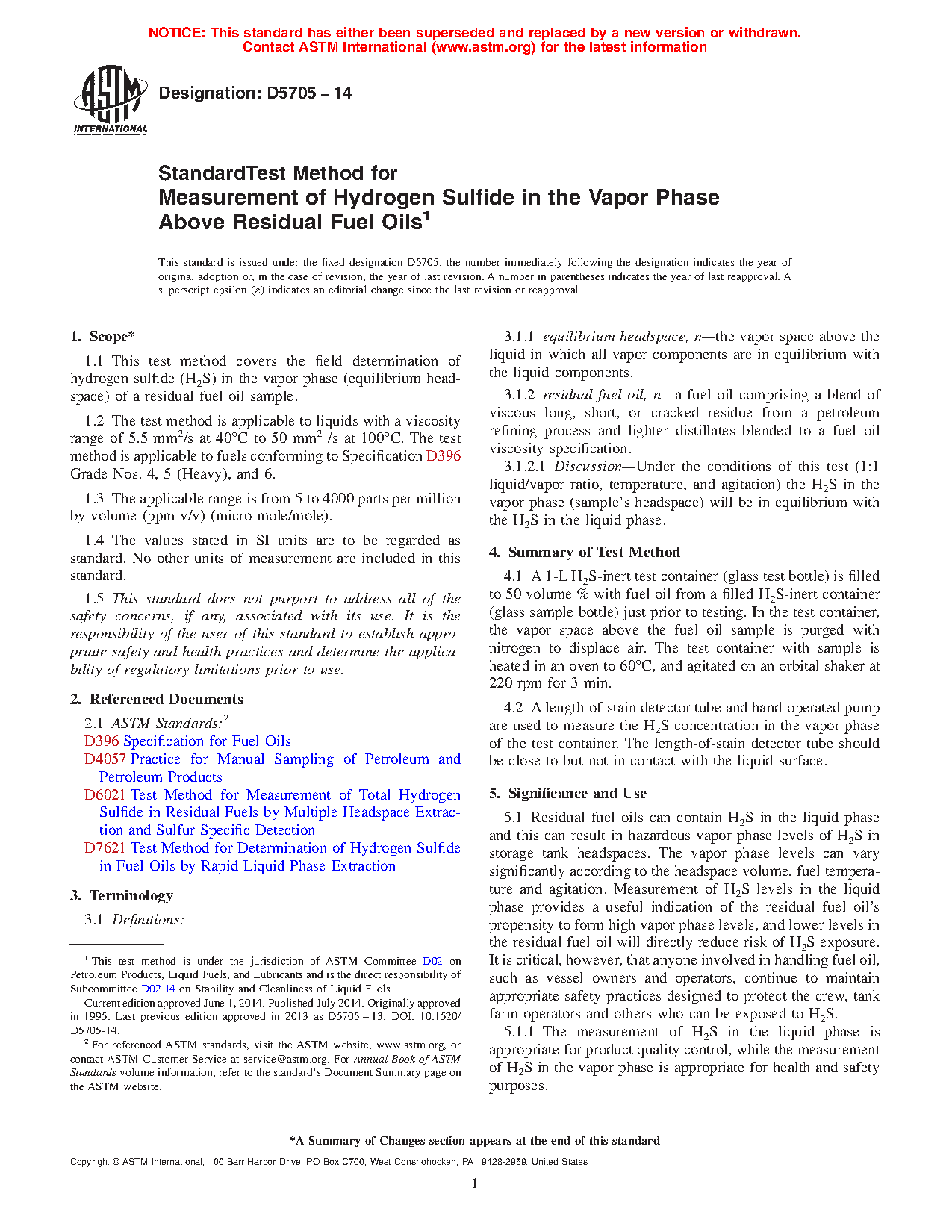 Note 1: D5705 is one of three test methods for quantitatively measuring H2S in residual fuels: