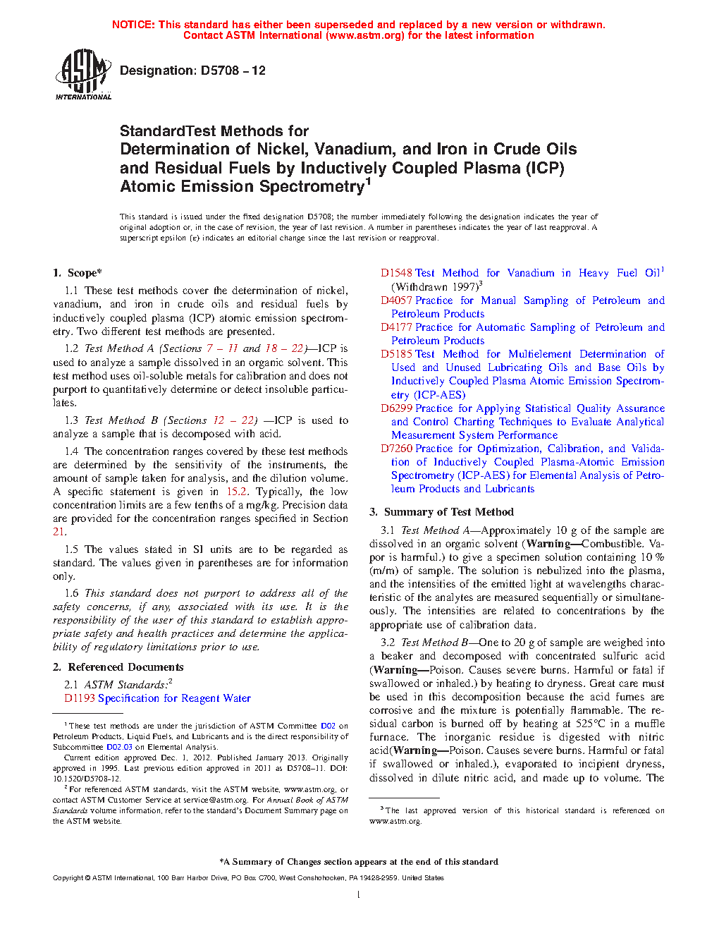 1.1 These test methods cover the determination of nickel, vanadium, and iron in crude oils and residual fuels by inductively coupled plasma (ICP) atomic emission spectrometry. Two different test methods are presented.