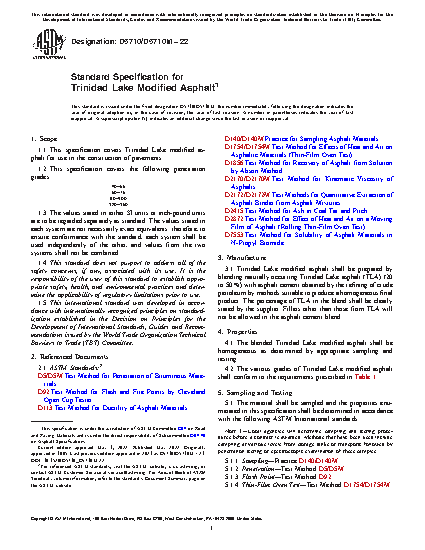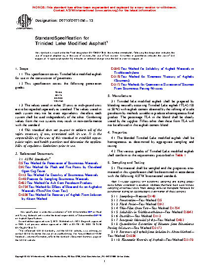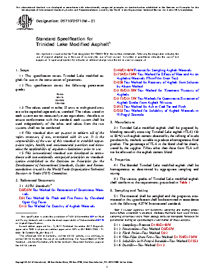 This specification covers Trinidad lake modified asphalt for use in the construction of pavements. The blended Trinidad lake modified asphalt shall be homogeneous as determined by appropriate sampling and testing. The penetration, flash point, thin-film oven, solubility in trichloroethylene, and ductility of the material shall be tested to meet the requirements prescribed. The inorganic material (ash), quantitative extraction of bitumen from bituminous paving mixtures, recovery of asphalt from solution by Abson method, and kinematic viscosity of asphalt shall be tested to meet the requirements prescribed.
