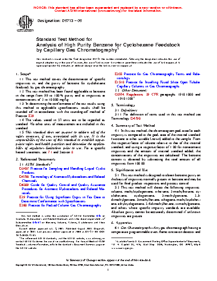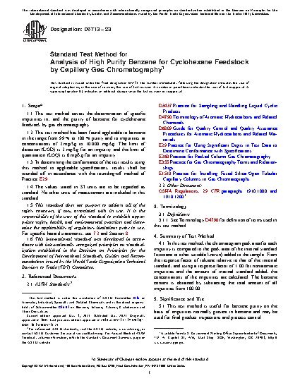 1.1 This test method covers the determination of specific impurities in, and the purity of benzene for cyclohexane feedstock by gas chromatography.
