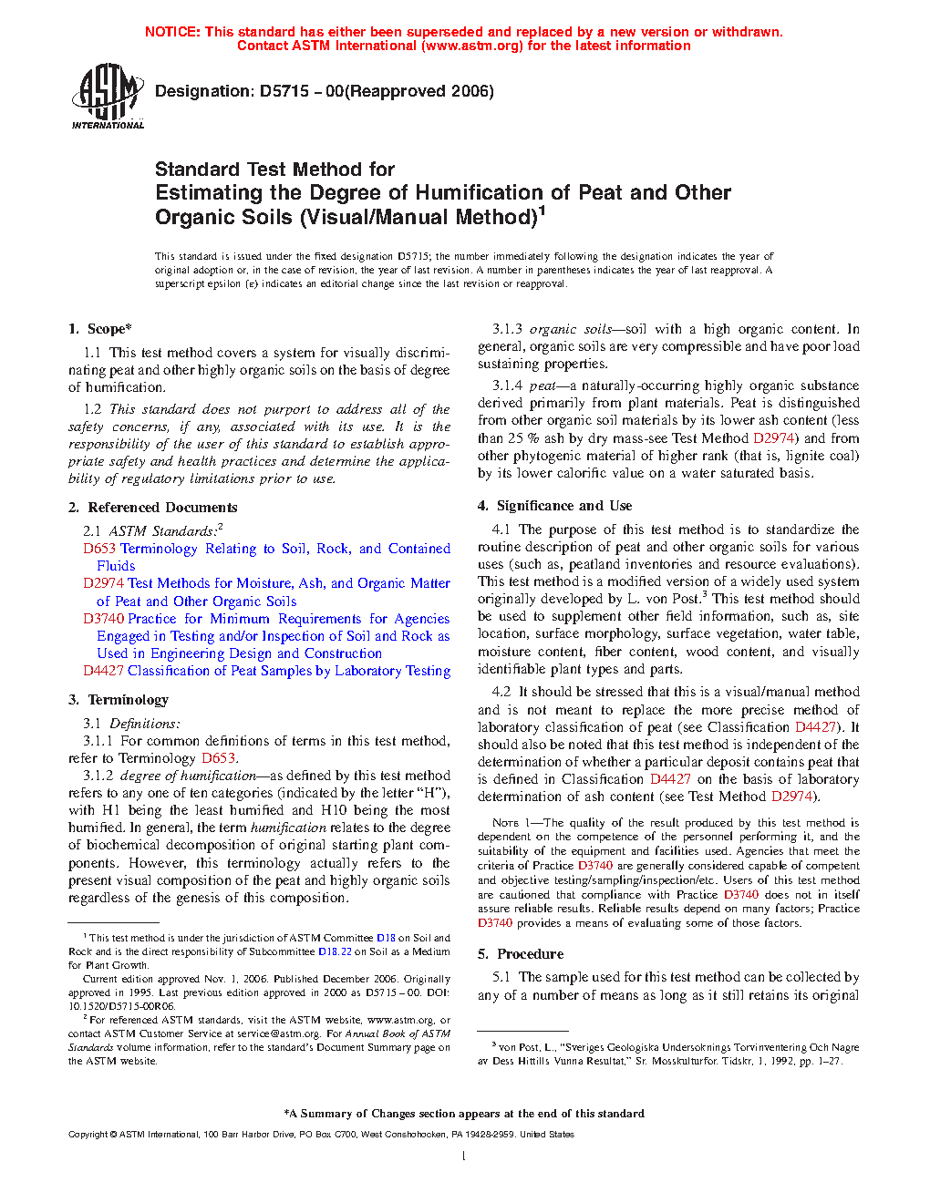 Standard Test Method for Estimating the Degree of Humification of Peat and Other Organic Soils (Visual/Manual Method)
