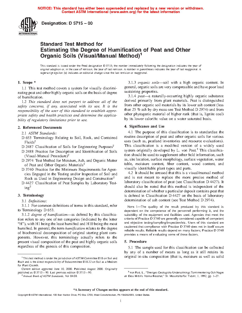 Note 1: This standard is a visual/manual method and is not meant to replace the more precise method of laboratory classification of peat (see Classification D4427). It should also be noted, this practice is independent of the determination of whether a particluar deposit contains peat that is defined in Classification D4427 on the basis of laboratory determination of ash content (see Test Method D2974).
