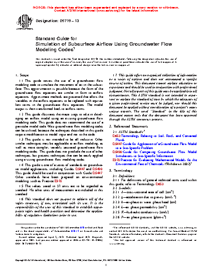 1.1 This guide covers the use of a groundwater flow modeling code to simulate the movement of air in the subsurface. This approximation is possible because the form of the groundwater flow equations are similar in form to airflow equations. Approximate methods are presented that allow the variables in the airflow equations to be replaced with equivalent terms in the groundwater flow equations. The model output is then transformed back to airflow terms.