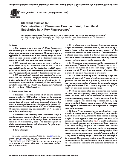 1.1 This practice covers the use of X-ray fluorescence (XRF) techniques for determination of the coating weight of chromium treatments on metal substrates. These techniques are applicable for determination of the coating weight as chromium or total coating weight of a chromium-containing treatment, or both, on a variety of metal substrates.