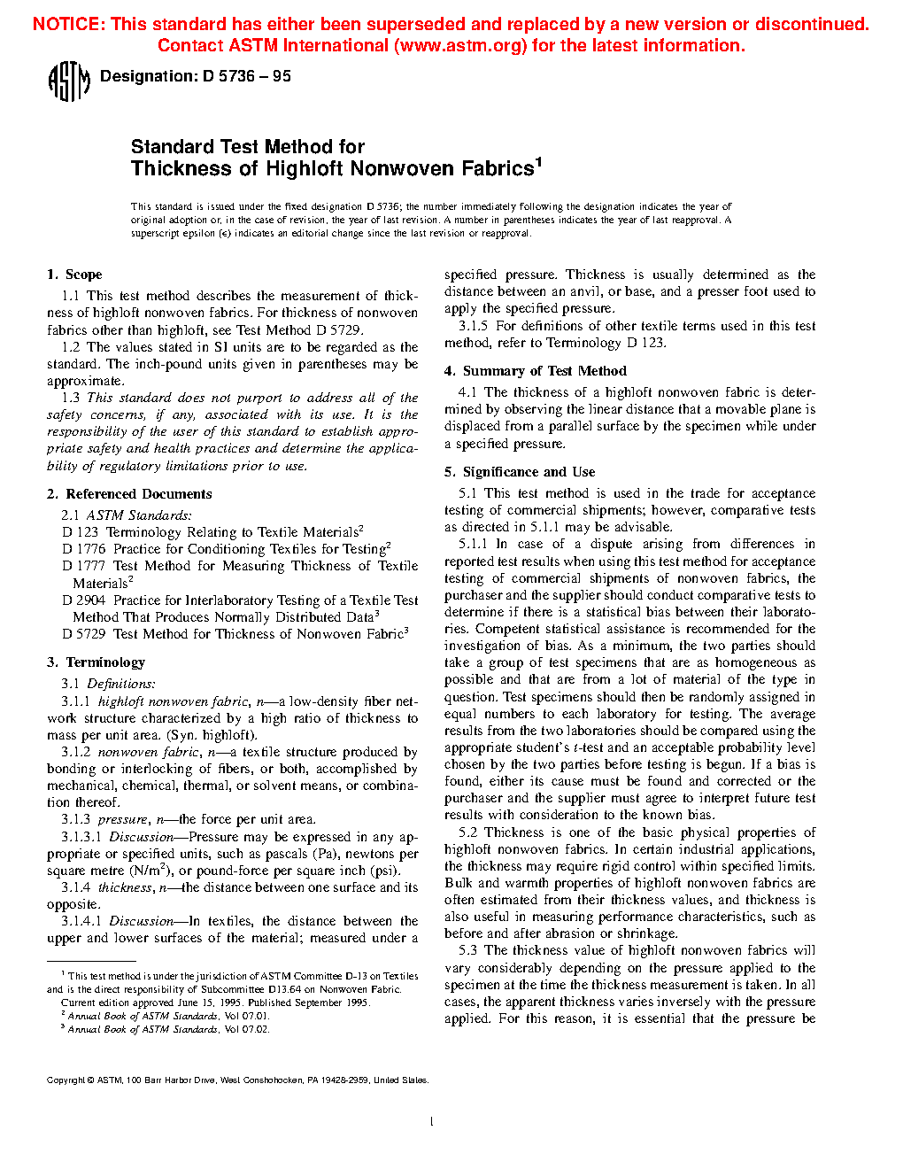1.1 This test method describes the measurement of thickness of highloft nonwoven fabrics. For thickness of nonwoven fabrics other than highloft, see Test Method D5729.