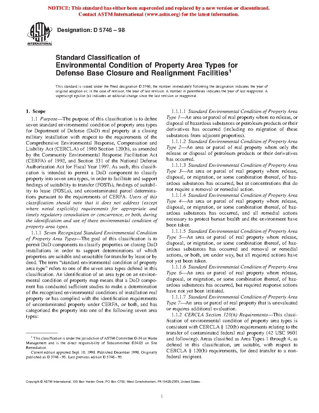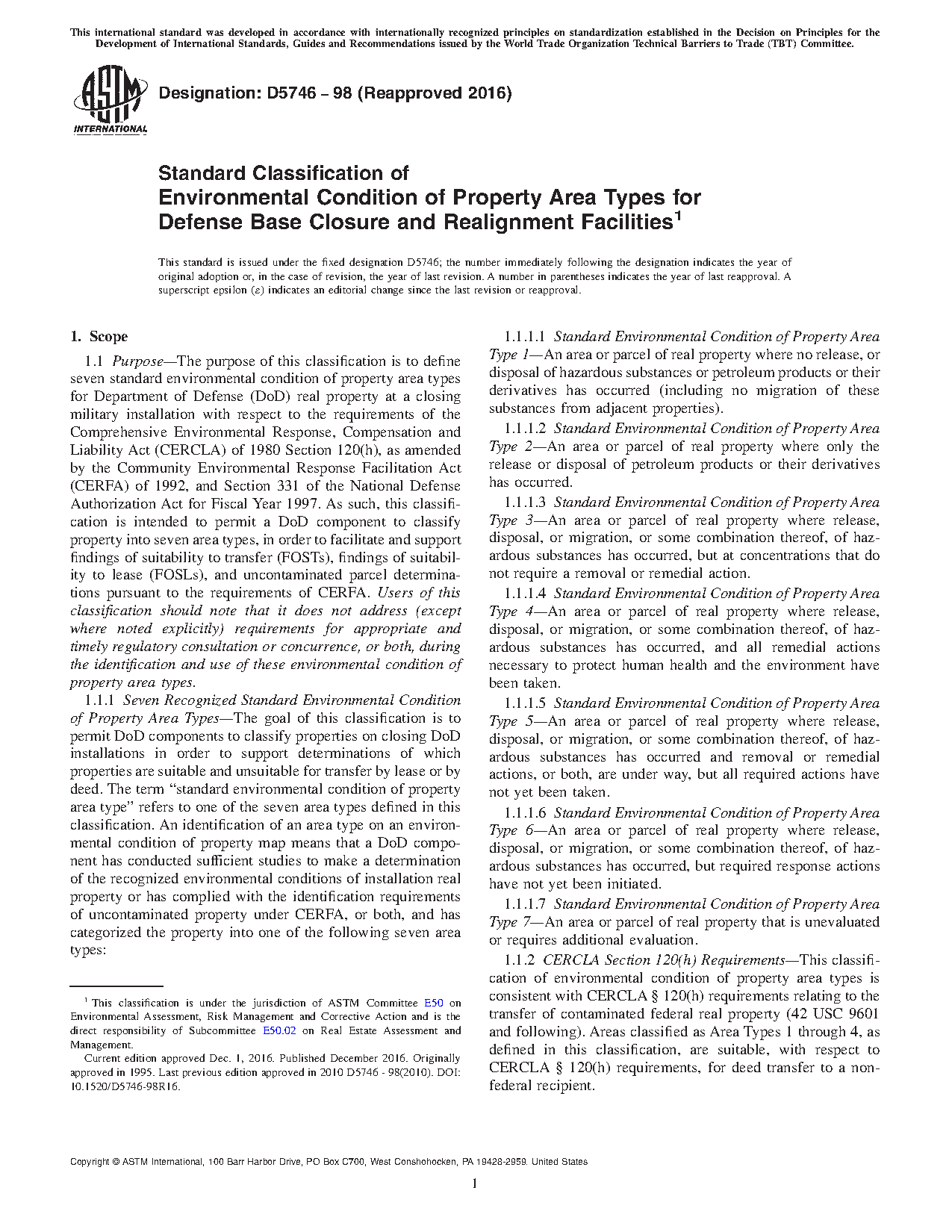 1.1 Purpose—The purpose of this classification is to define seven standard environmental condition of property area types for Department of Defense (DoD) real property at a closing military installation with respect to the requirements of the Comprehensive Environmental Response, Compensation and Liability Act (CERCLA) of 1980 Section 120(h), as amended by the Community Environmental Response Facilitation Act (CERFA) of 1992, and Section 331 of the National Defense Authorization Act for Fiscal Year 1997. As such, this classification is intended to permit a DoD component to classify property into seven area types, in order to facilitate and support findings of suitability to transfer (FOSTs), findings of suitability to lease (FOSLs), and uncontaminated parcel determinations pursuant to the requirements of CERFA. Users of this classification should note that it does not address (except where noted explicitly) requirements for appropriate and timely regulatory consultation or concurrence, or both, during the identification and use of these environmental condition of property area types.