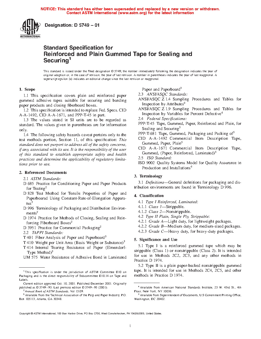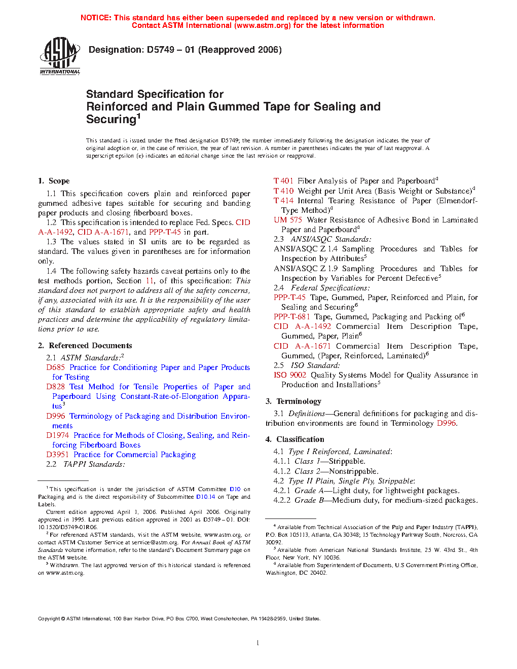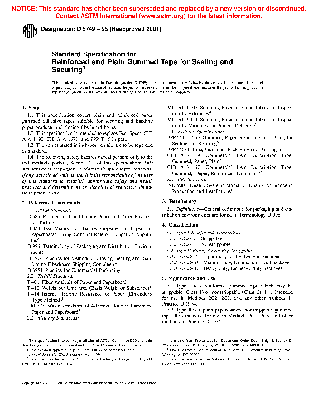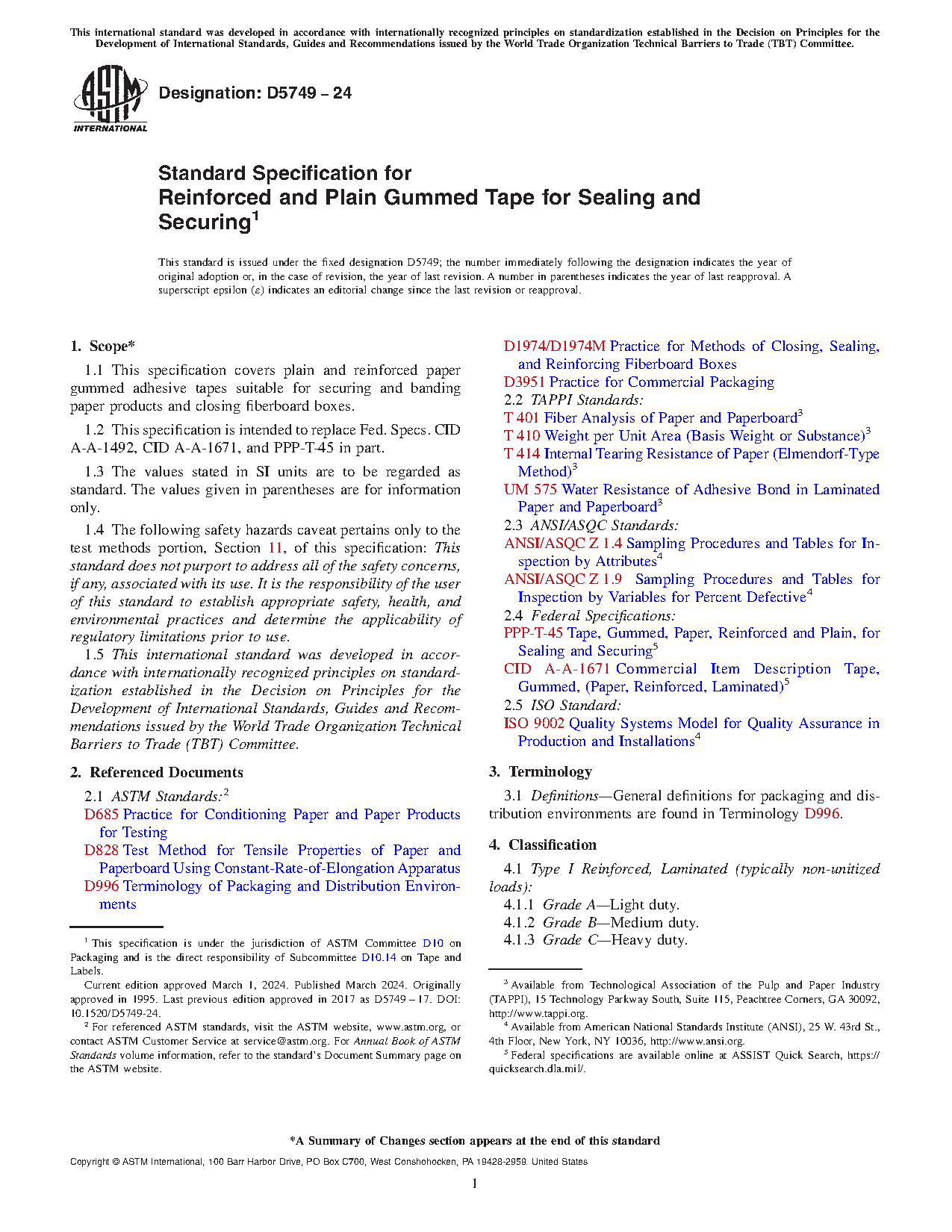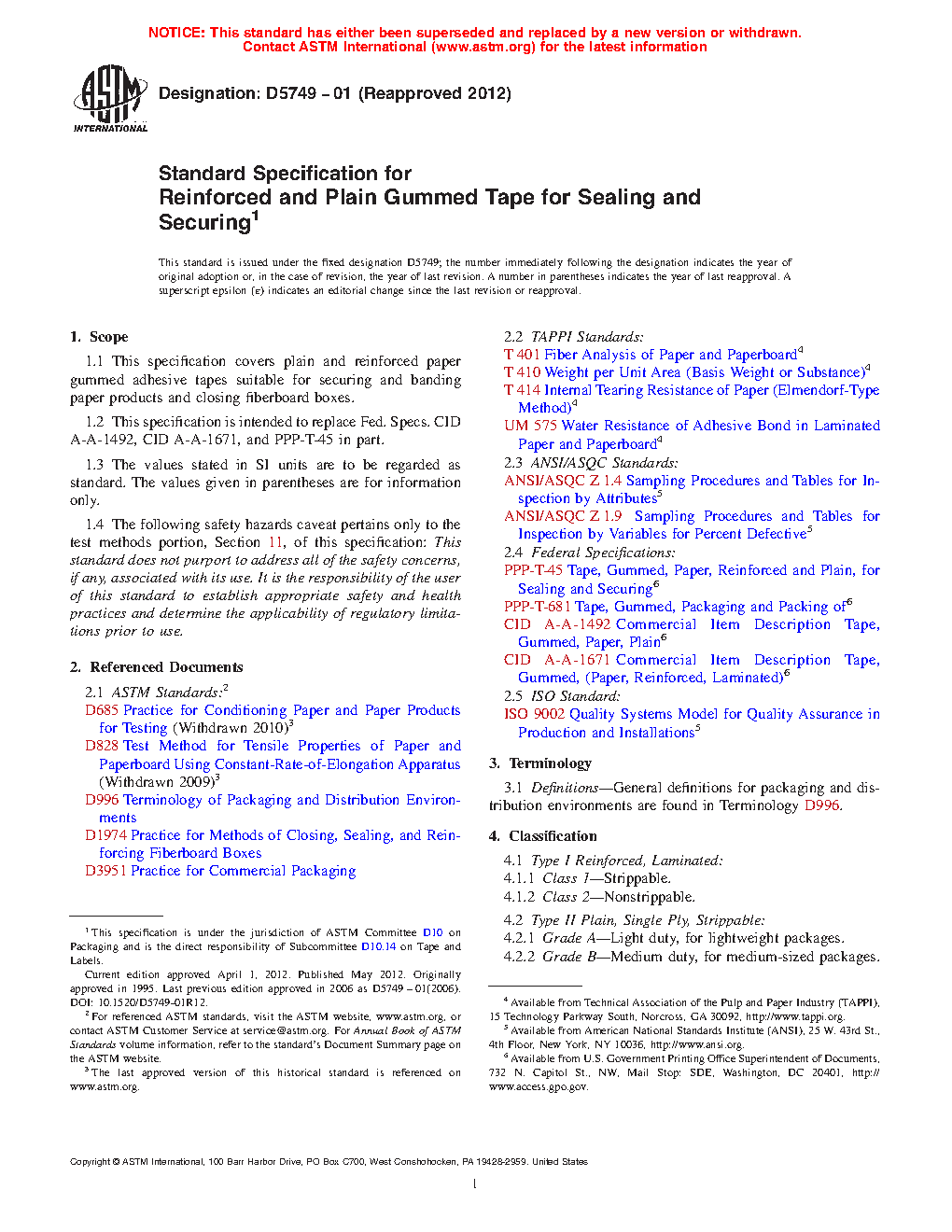 1.1 This specification covers plain and reinforced paper gummed adhesive tapes suitable for securing and banding paper products and closing fiberboard boxes.