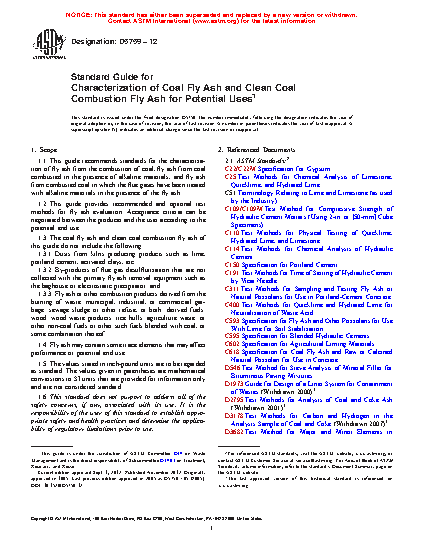 1.1 This guide recommends standards for the characterization of fly ash from the combustion of coal, fly ash from coal combusted in the presence of alkaline materials, and fly ash from combusted coal in which the flue gases have been treated with alkaline materials in the presence of the fly ash.