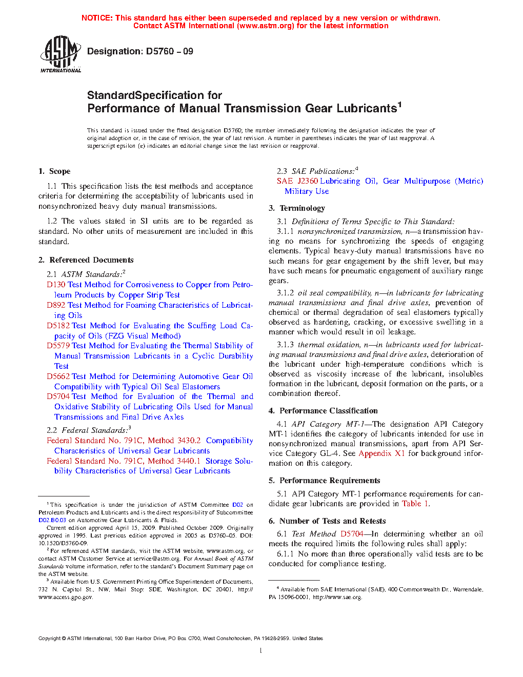 This specification provides a list of test methods and acceptance criteria for determining the performance acceptability of gear lubricants used in nonsynchronized heavy duty manual transmission (MT-1). The test methods listed here shall be able to examine the following properties of the gear lubricants: viscosity increase; pentane insolubles; toluene insolubles; carbon/varnish rating; sludge rating; hardness and volume change, and elongation of polyacrylate and fluoroelastomer; falling load stage; and foam tendency.