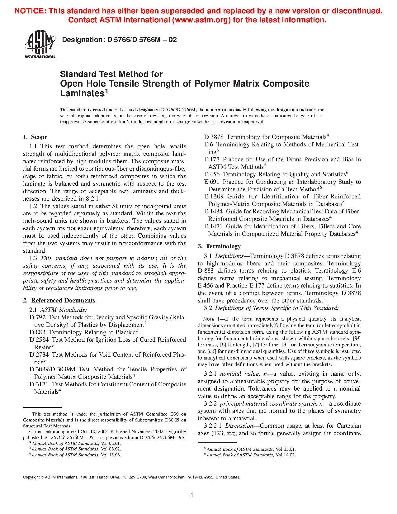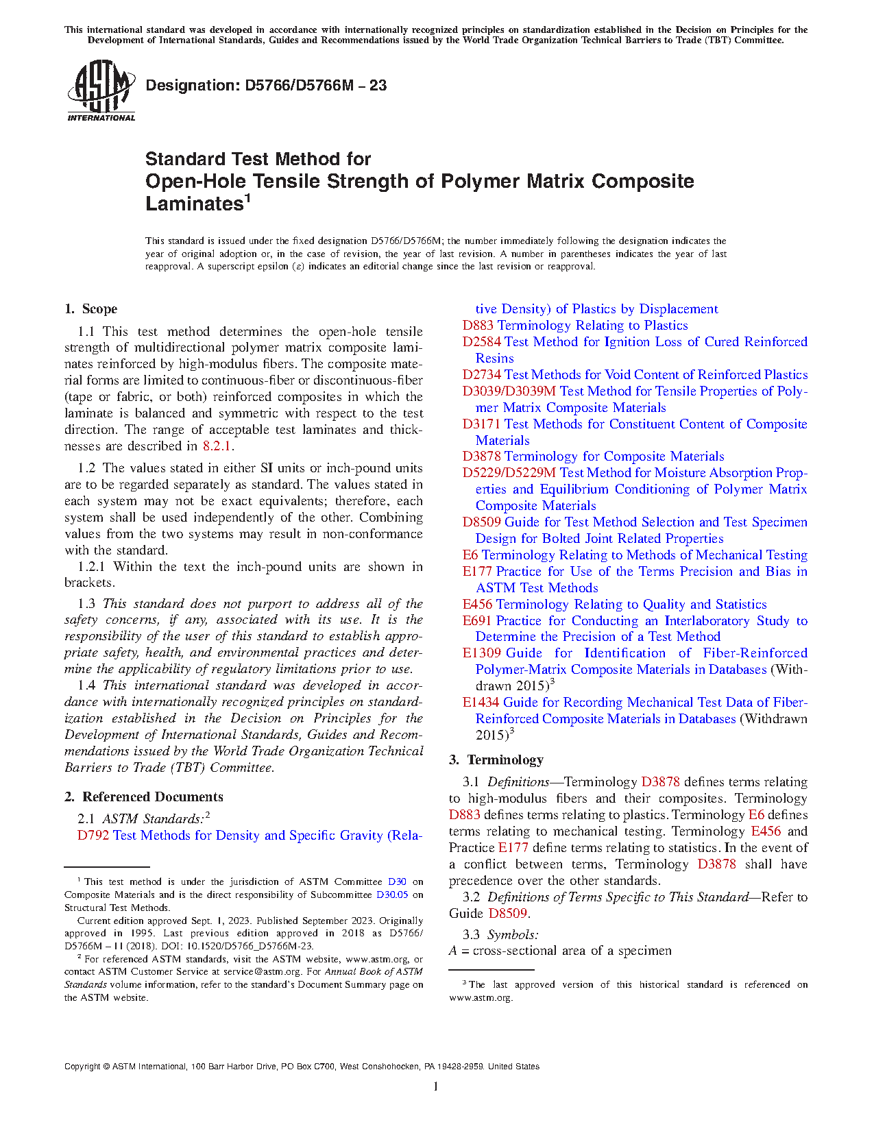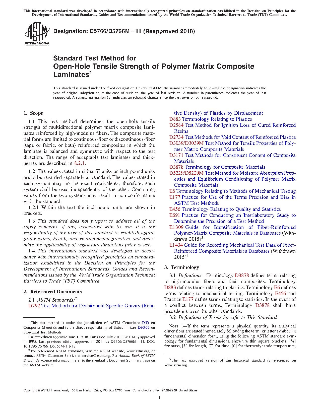 1.1 This test method determines the open-hole tensile strength of multidirectional polymer matrix composite laminates reinforced by high-modulus fibers. The composite material forms are limited to continuous-fiber or discontinuous-fiber (tape or fabric, or both) reinforced composites in which the laminate is balanced and symmetric with respect to the test direction. The range of acceptable test laminates and thicknesses are described in 8.2.1.