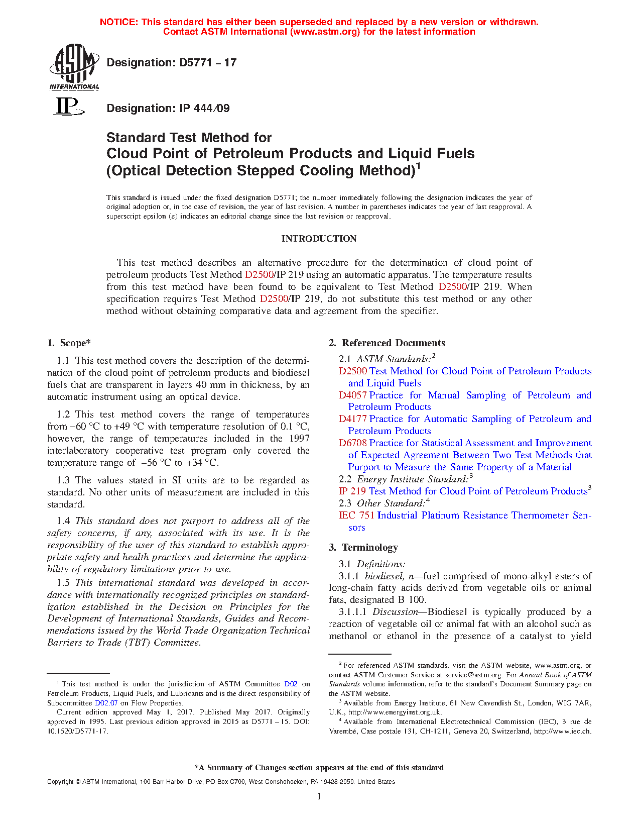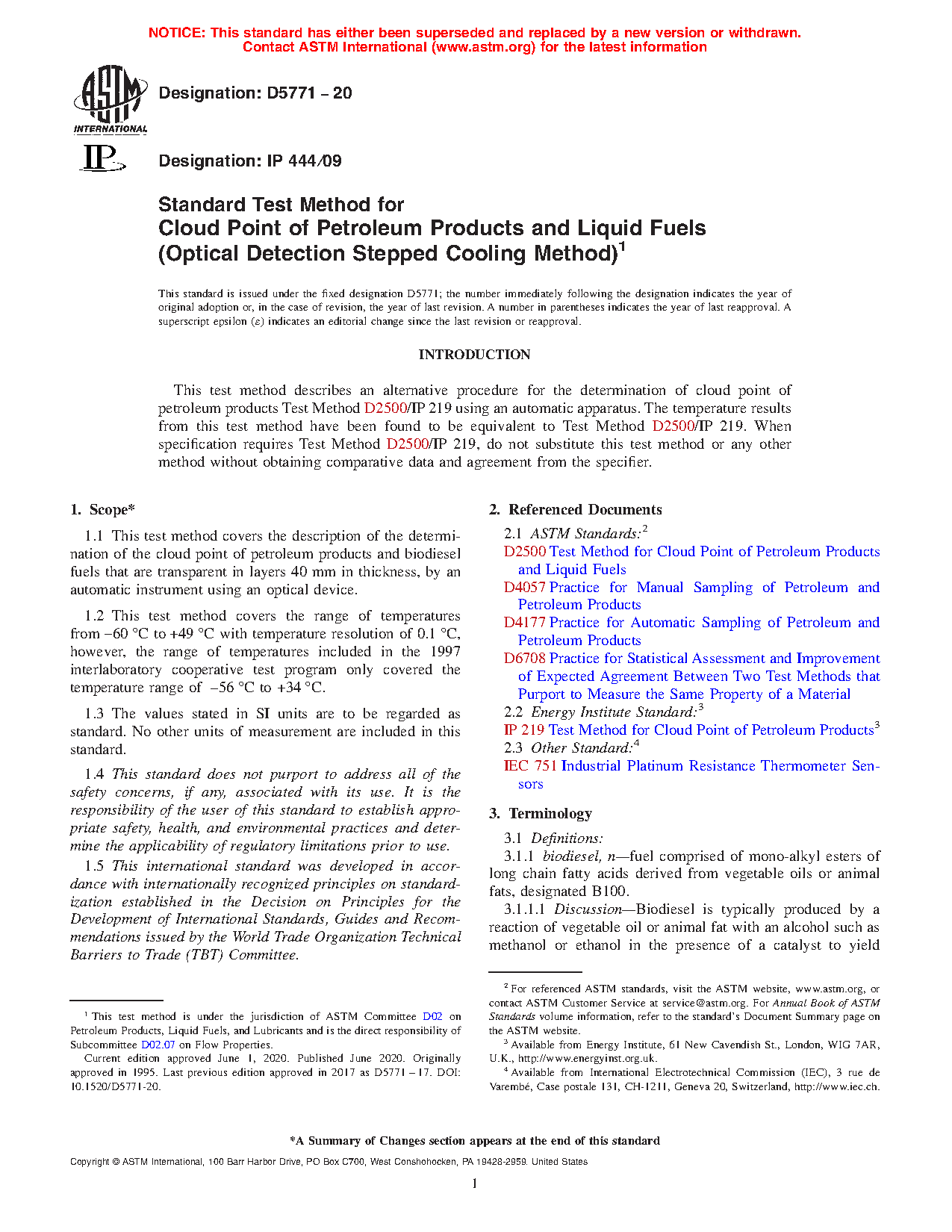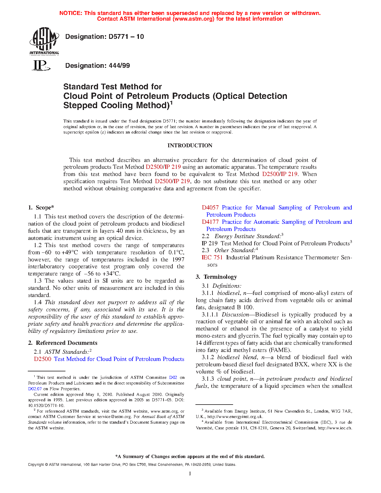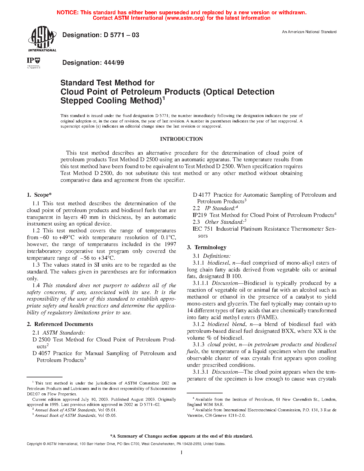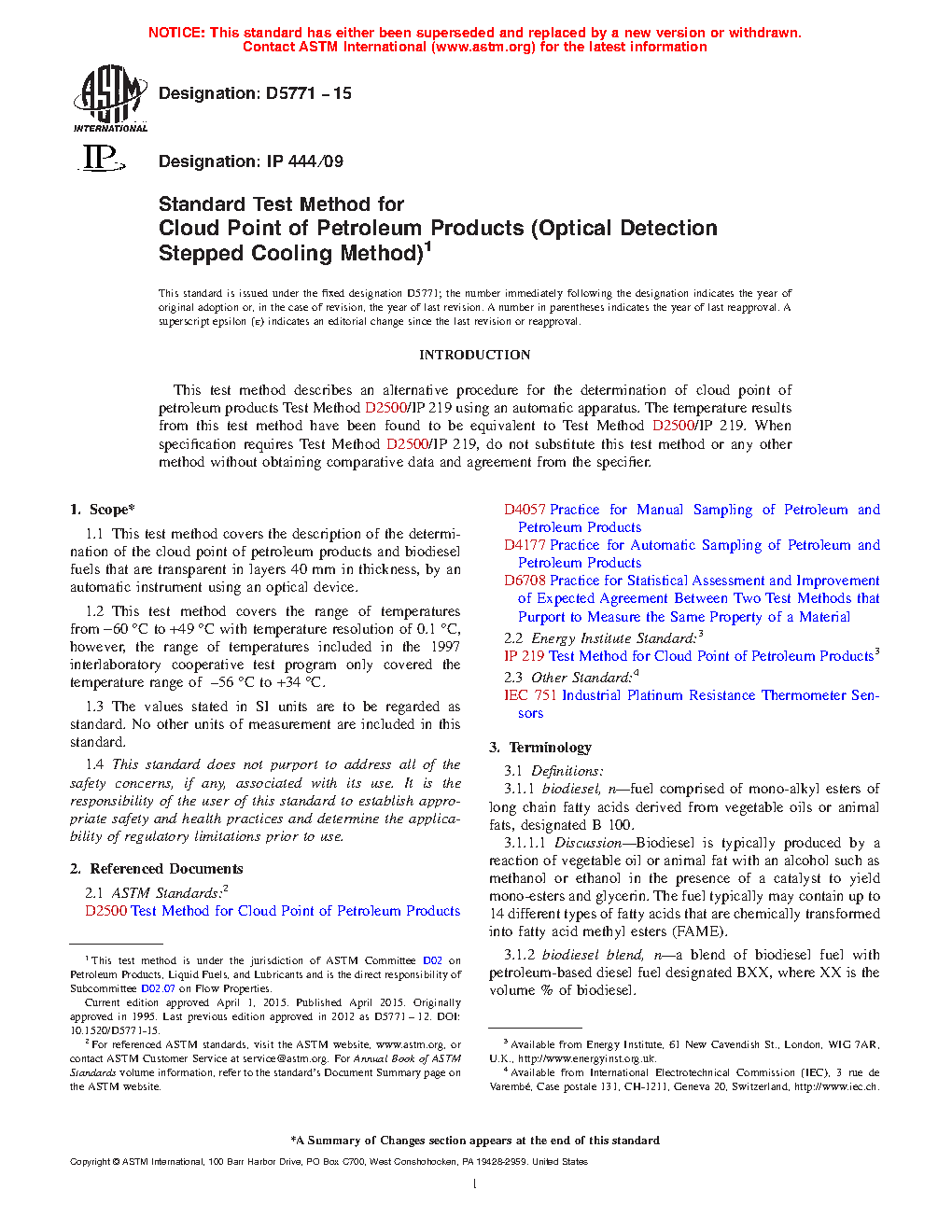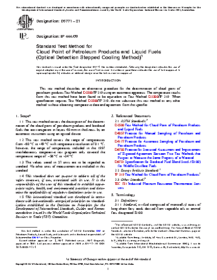 1.1 This test method covers the description of the determination of the cloud point of petroleum products and biodiesel fuels that are transparent in layers 40 mm in thickness, by an automatic instrument using an optical device.