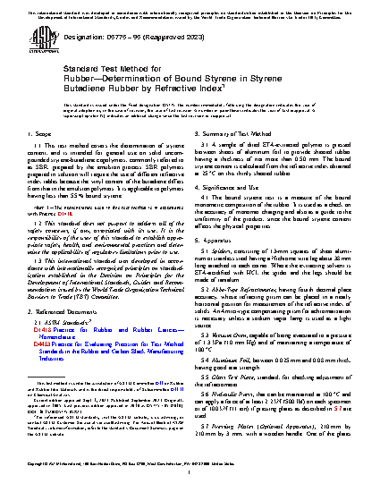 1.1 This test method covers the determination of styrene content, and is intended for general use on solid uncompounded styrene-butadiene copolymers, commonly referred to as SBR, prepared by the emulsion process. SBR polymers prepared in solution will require the use of different refractive index tables because the vinyl content of the butadiene differs from that in the emulsion polymers. It is applicable to polymers having less than 55 % bound styrene.