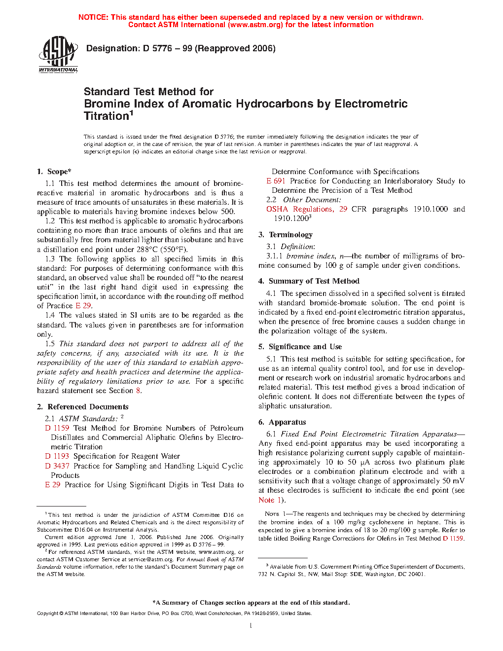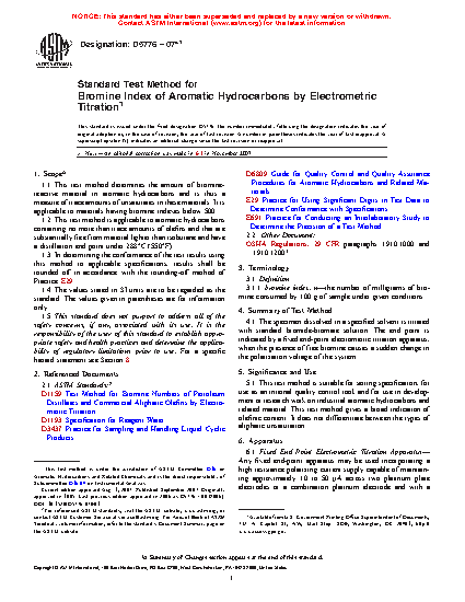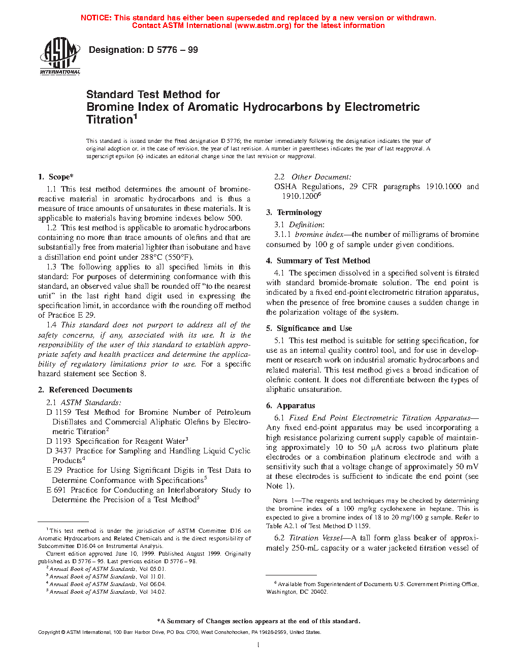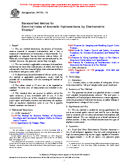 1.1 This test method determines the amount of bromine-reactive material in aromatic hydrocarbons and is thus a measure of trace amounts of unsaturates in these materials. It is applicable to materials having bromine indexes below 35. Materials with a higher bromine index can be analyzed by this method; however, the precision section does not apply.