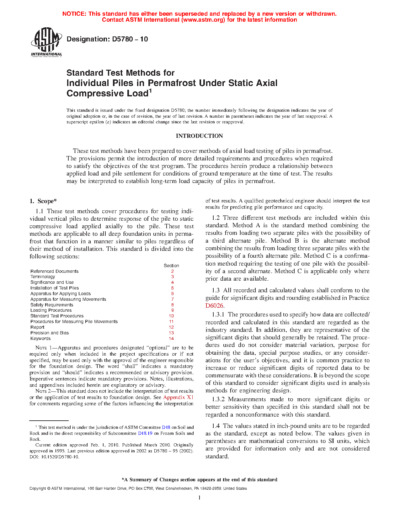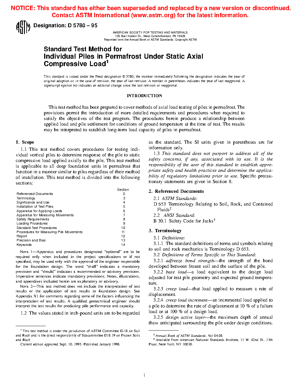 1.1 The test methods described in this standard measure the axial deflection of a vertical or inclined deep foundation when loaded in static axial compression. These methods apply to all deep foundations, referred to herein as piles, that function in a manner similar to driven piles or cast-in-place piles, regardless of their method of installation, and may be used for testing single piles or pile groups. The test results may not represent the long-term performance of a deep foundation.