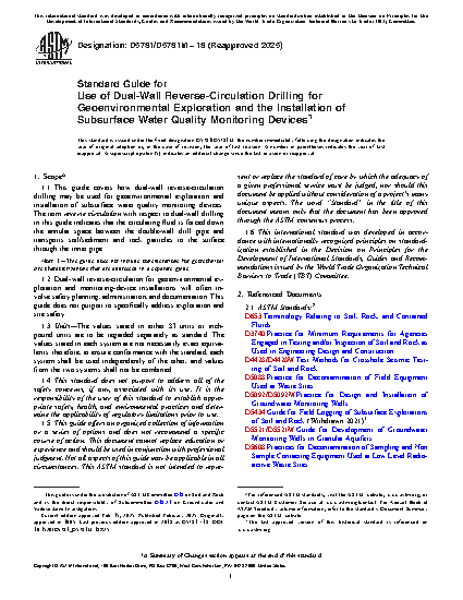 1.1 This guide covers how dual-wall reverse-circulation drilling may be used for geoenvironmental exploration and installation of subsurface water quality monitoring devices. The term reverse circulation with respect to dual-wall drilling in this guide indicates that the circulating fluid is forced down the annular space between the double-wall drill pipe and transports soil/sediment and rock particles to the surface through the inner pipe.