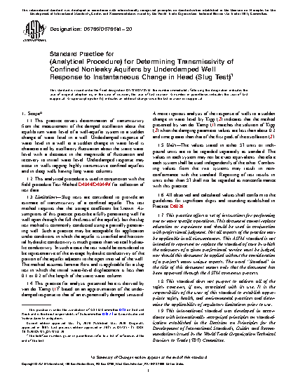 1.1 This practice covers determination of transmissivity from the measurement of the damped oscillation about the equilibrium water level of a well-aquifer system to a sudden change of water level in a well. Underdamped response of water level in a well to a sudden change in water level is characterized by oscillatory fluctuation about the static water level with a decrease in the magnitude of fluctuation and recovery to initial water level. Underdamped response may occur in wells tapping highly transmissive confined aquifers and in deep wells having long water columns.