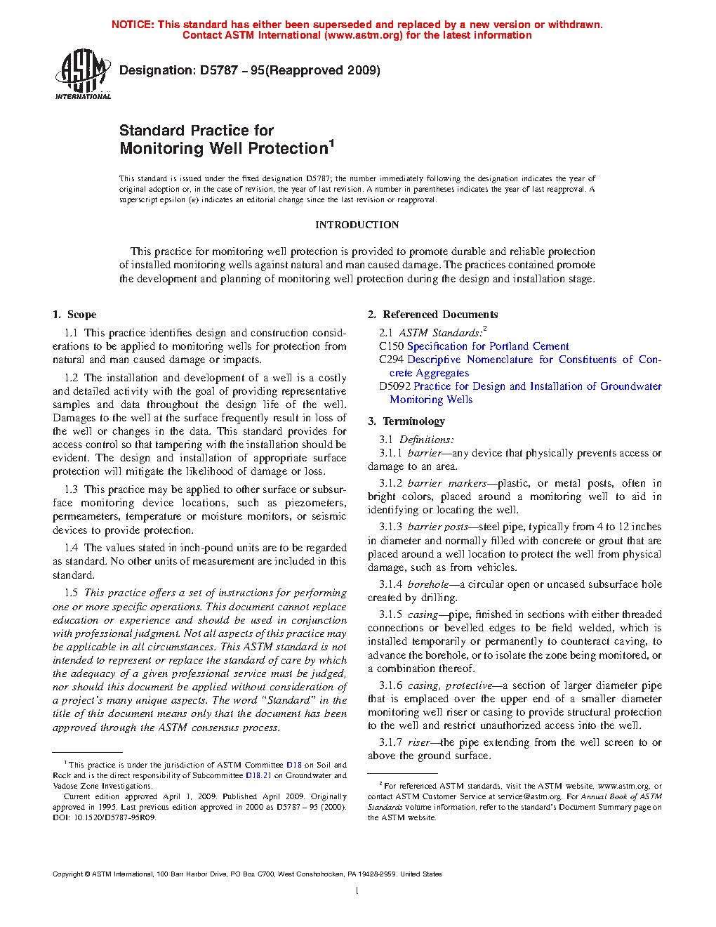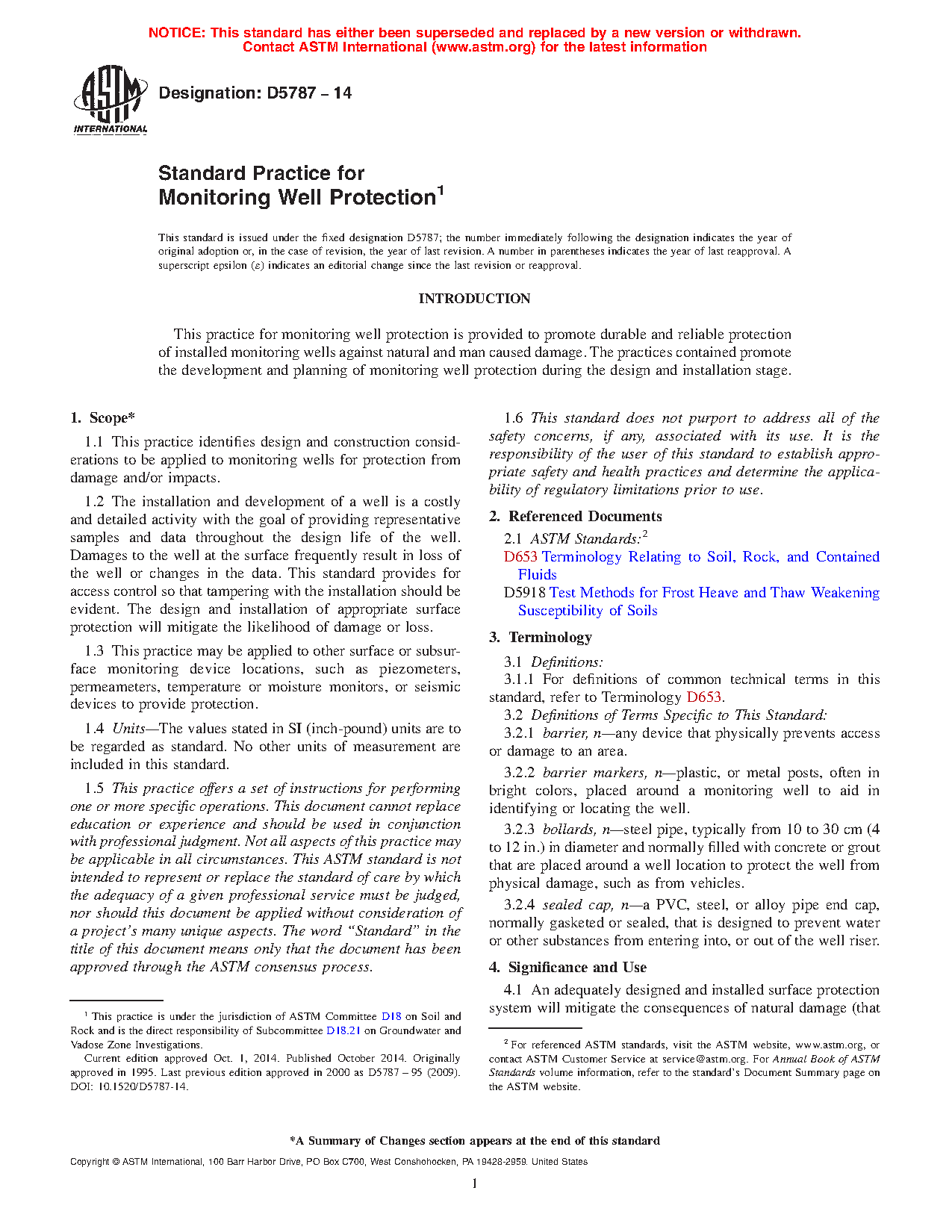 4.1 An adequately designed and installed surface protection system will mitigate the consequences of natural damage (e.g., freeze/thaw damage) in susceptible areas, or anthropogenic damages, which could otherwise occur and result in either changes to water level and/or groundwater quality data, or complete loss of the monitoring well.