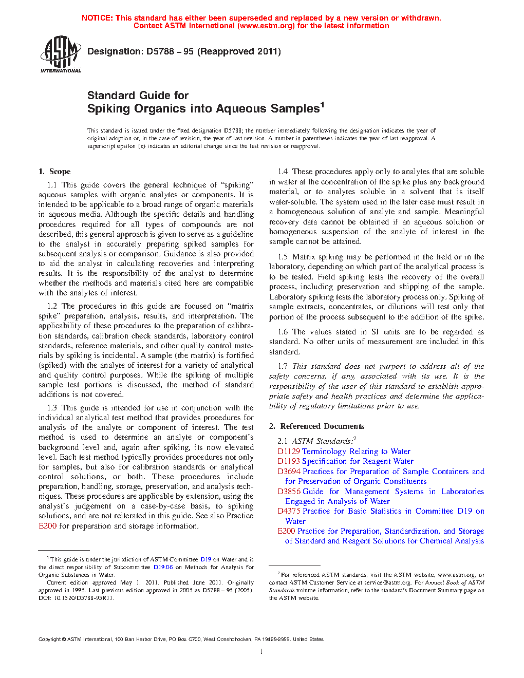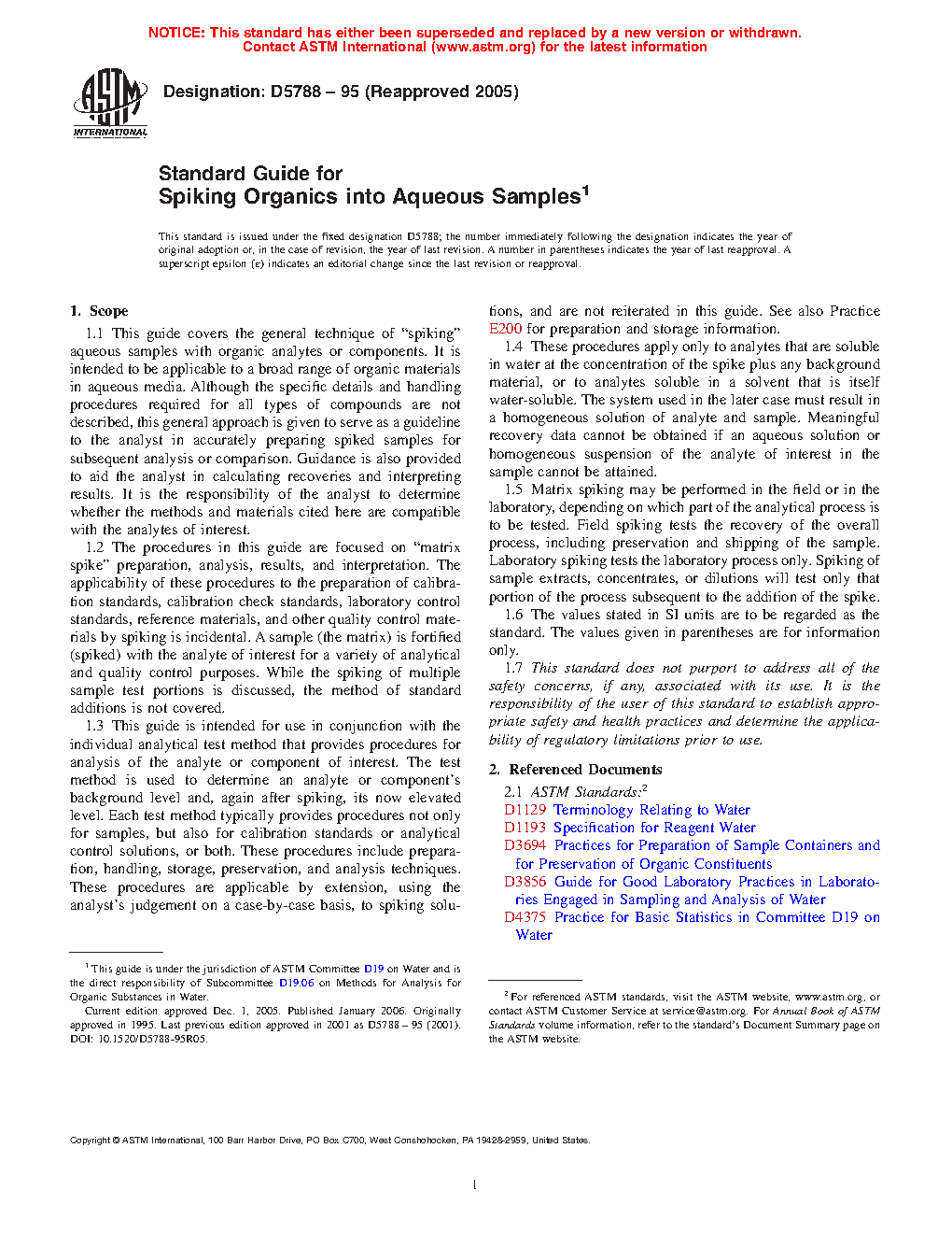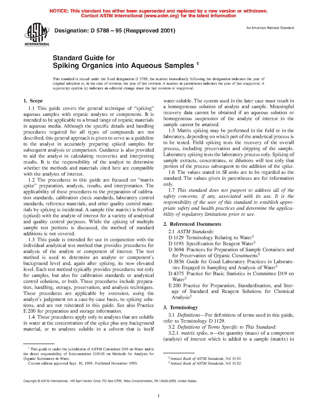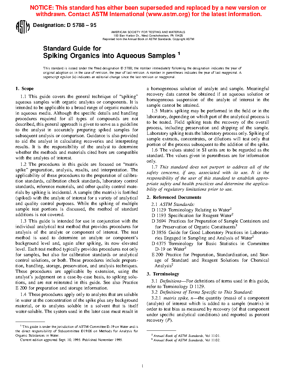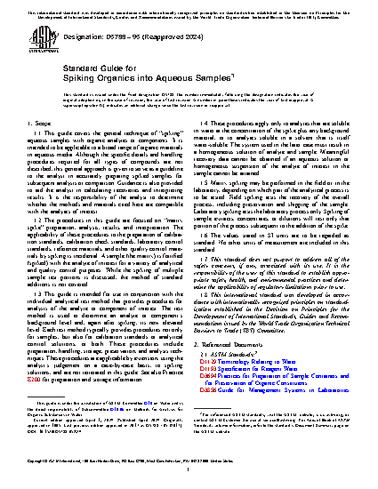 1.3 This guide is intended for use in conjunction with the individual analytical test method that provides procedures for analysis of the analyte or component of interest. The test method is used to determine an analyte or component's background level and, again after spiking, its now elevated level. Each test method typically provides procedures not only for samples, but also for calibration standards or analytical control solutions, or both. These procedures include preparation, handling, storage, preservation, and analysis techniques. These procedures are applicable by extension, using the analyst's judgement on a case-by-case basis, to spiking solutions, and are not reiterated in this guide. See also Practice E200 for preparation and storage information.