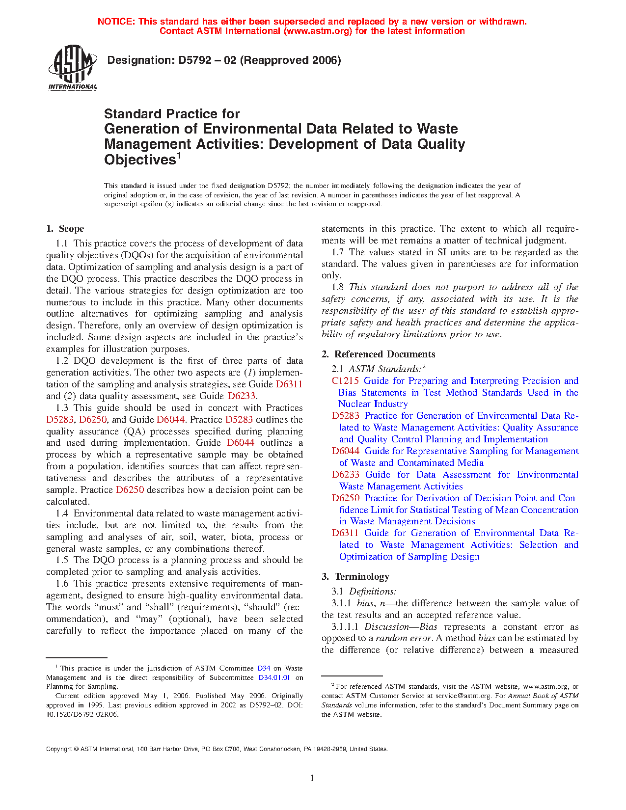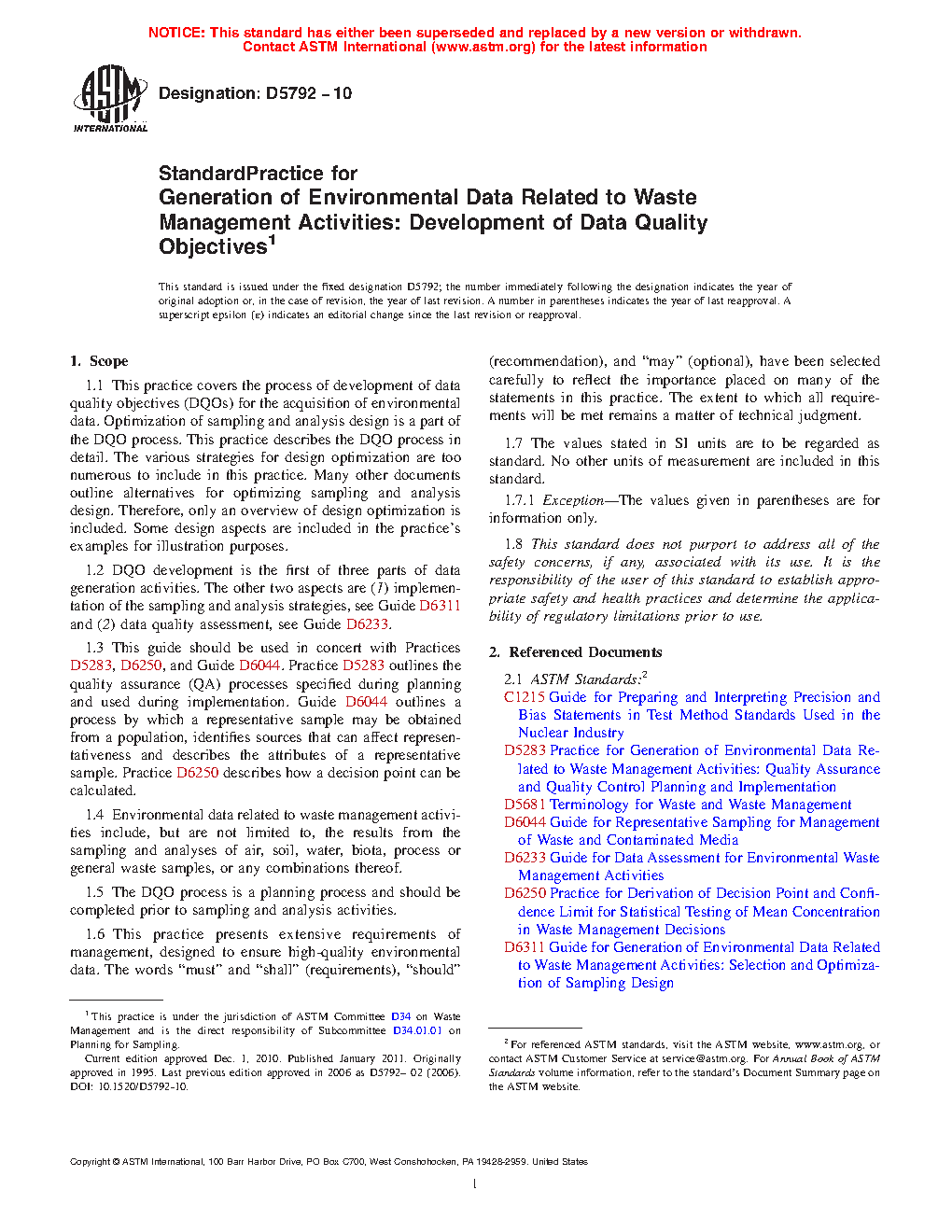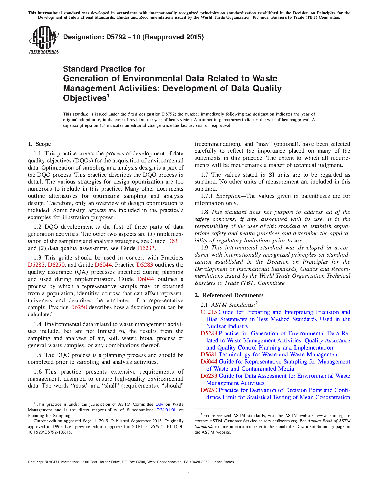 1.3 This guide should be used in concert with Practices D 5283, D 6250, and Guide D 6044. Practice D 5283 outlines the quality assurance (QA) processes specified during planning and used during implementation. Guide D 6044 outlines a process by which a representative sample may be obtained from a population, identifies sources that can affect representativeness and describes the attributes of a representative sample. Practice D 6250 describes how a decision point can be calculated.