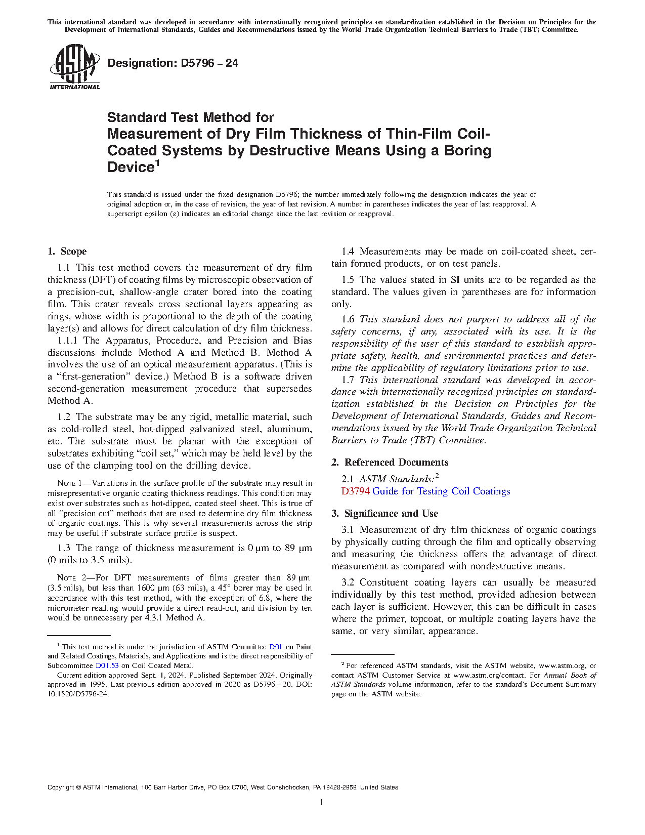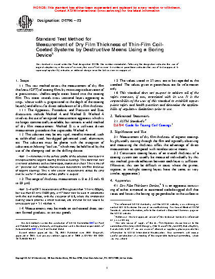 Note 2—For DFT measurements of films greater than 3.5 mils (89μm), but less than 63 mils (1600 μm), a 45° borer may be used in accordance with this test method, with the exception of 6.8, where the micrometer reading would provide a direct read-out, and division by ten would be unnecessary per 4.3.1 Method A.