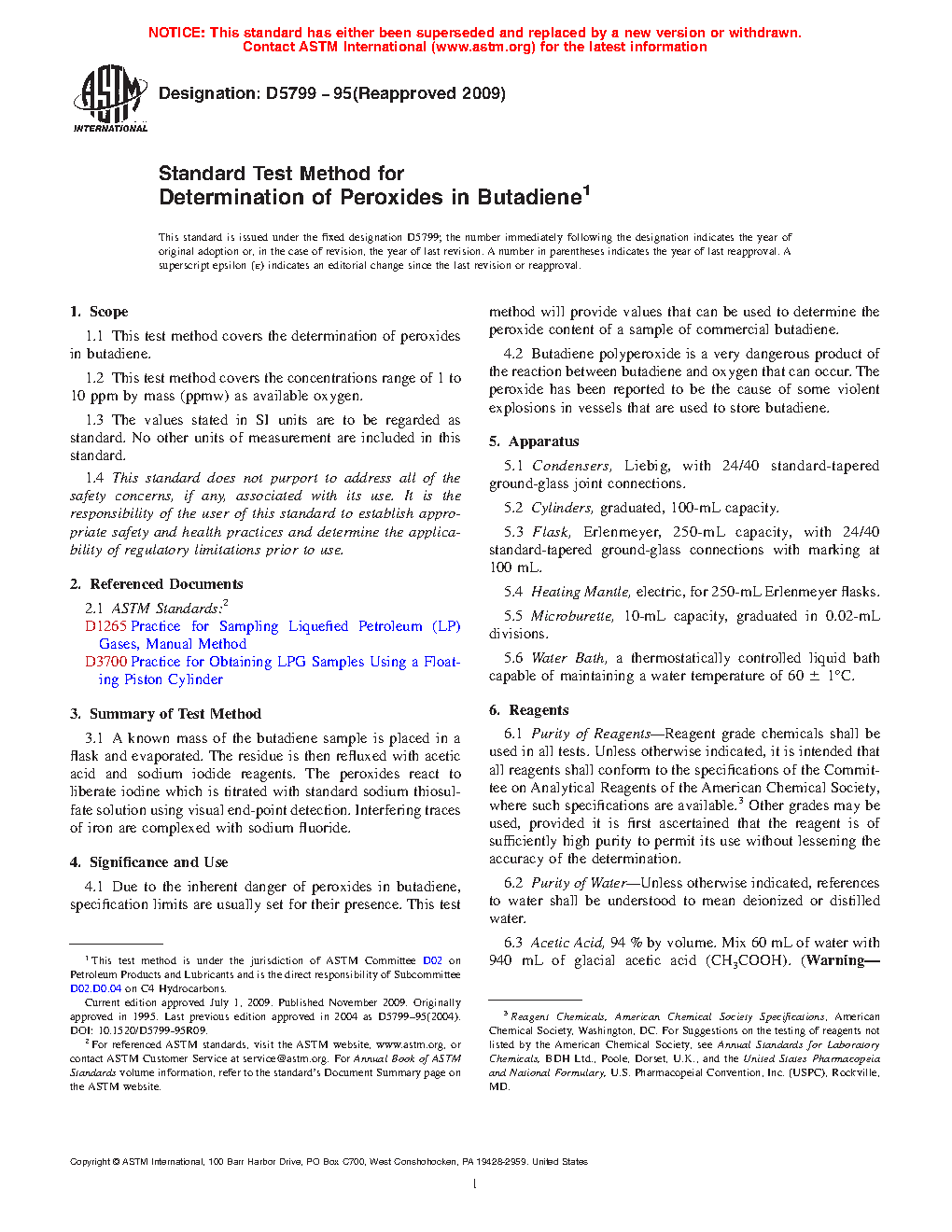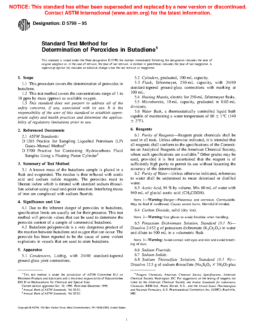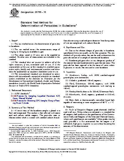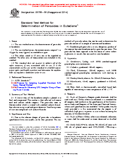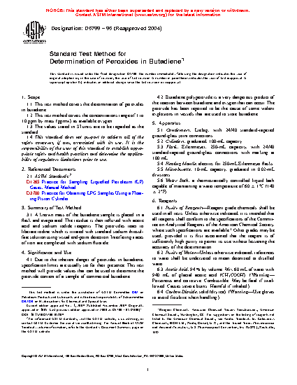 4.1 Due to the inherent danger of peroxides in butadiene, specification limits are usually set for their presence. This test method will provide values that can be used to determine the peroxide content of a sample of commercial butadiene.