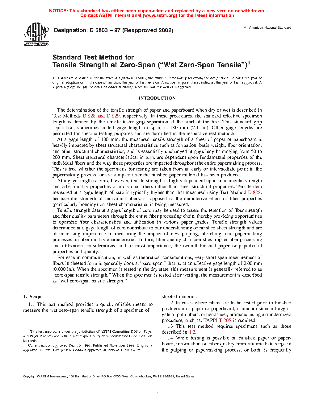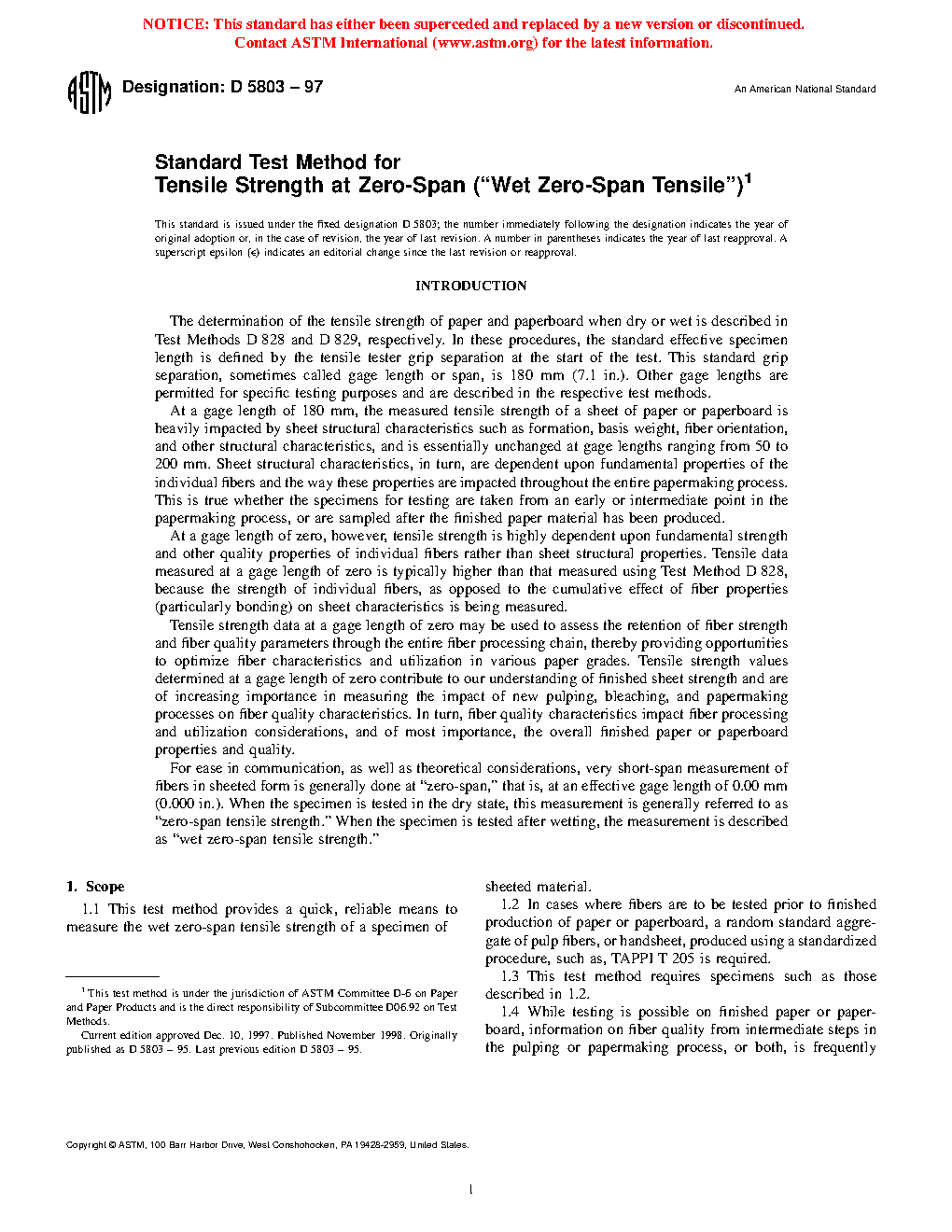 1.1 This test method provides a quick, reliable means to measure the wet zero-span tensile strength of a specimen of sheeted material.