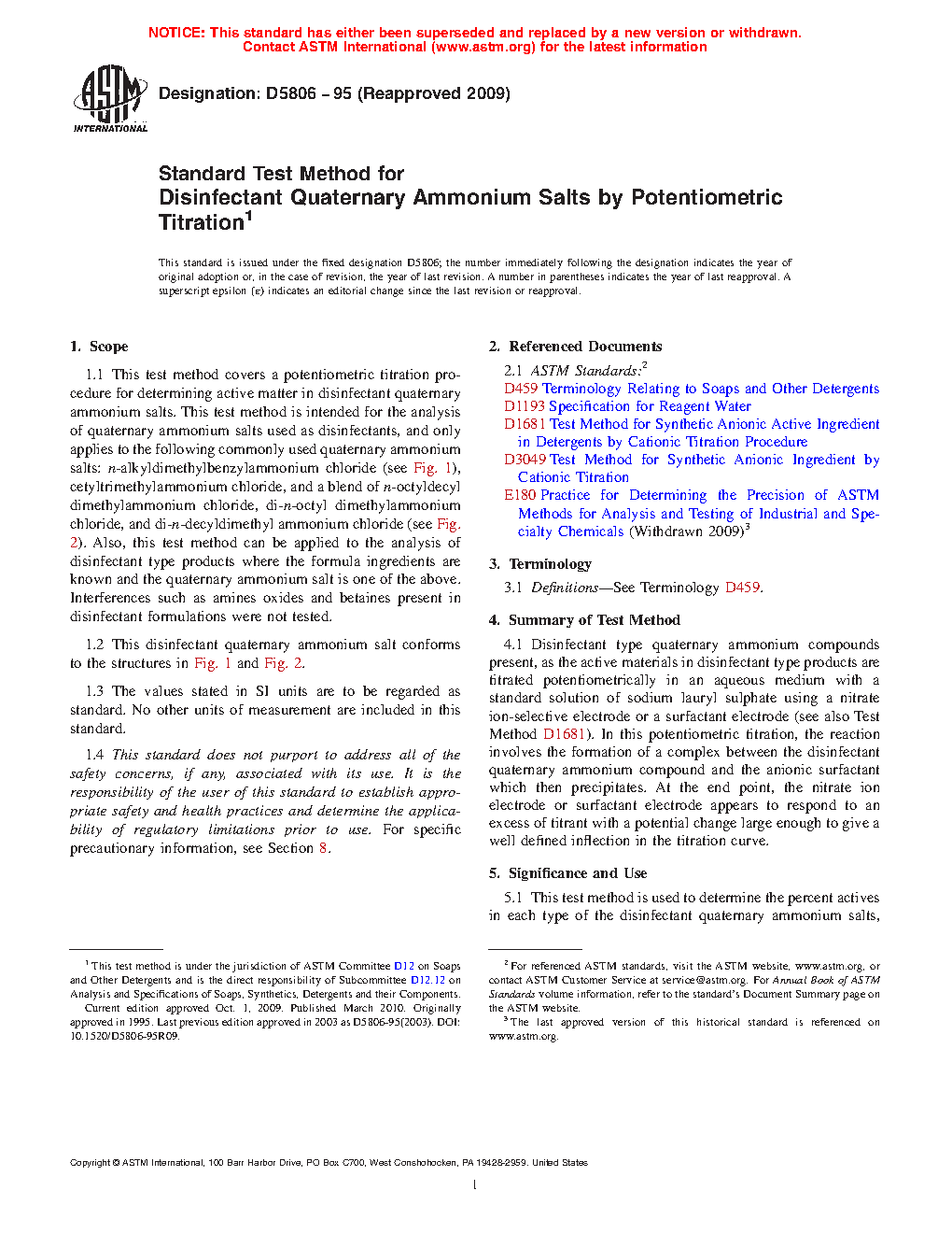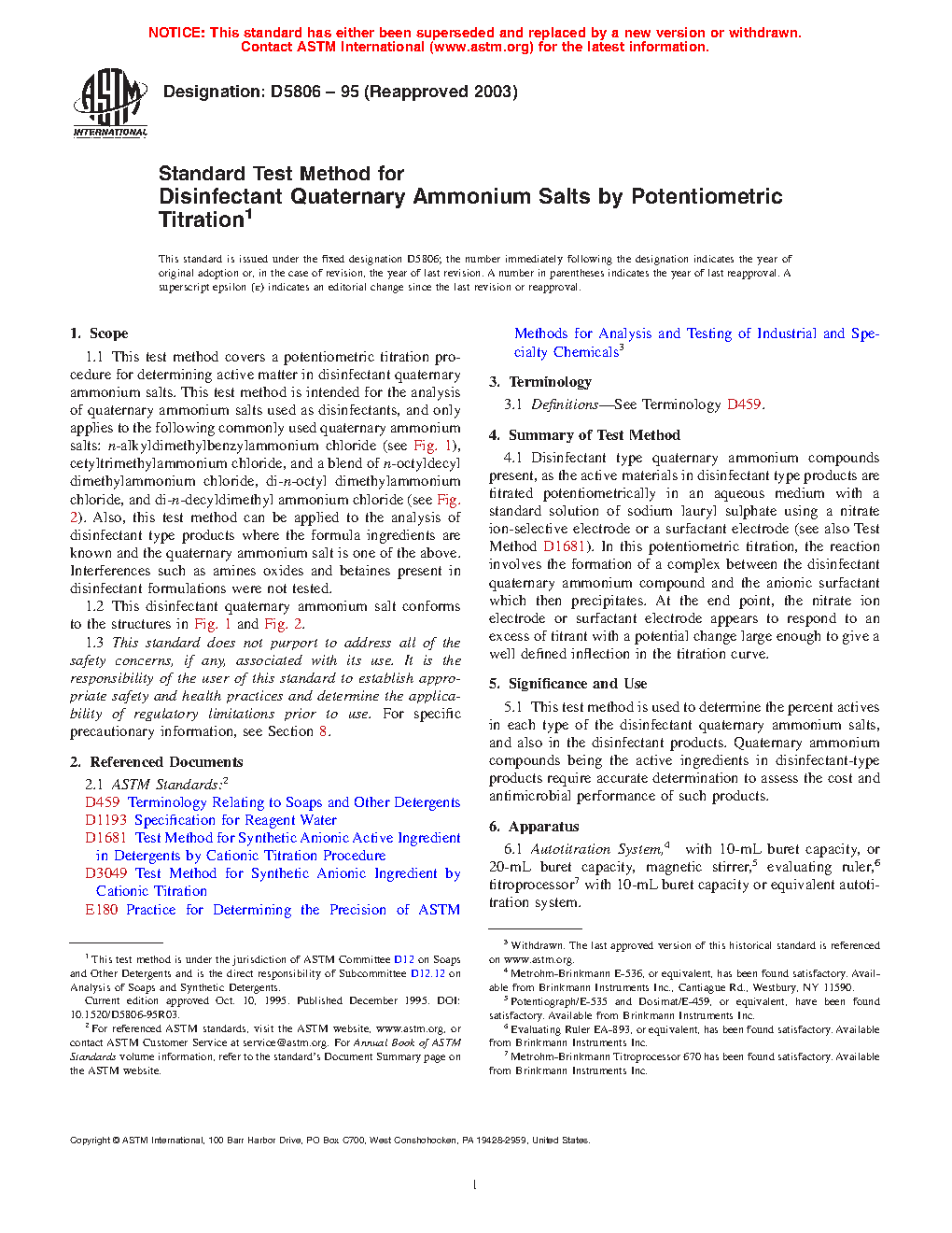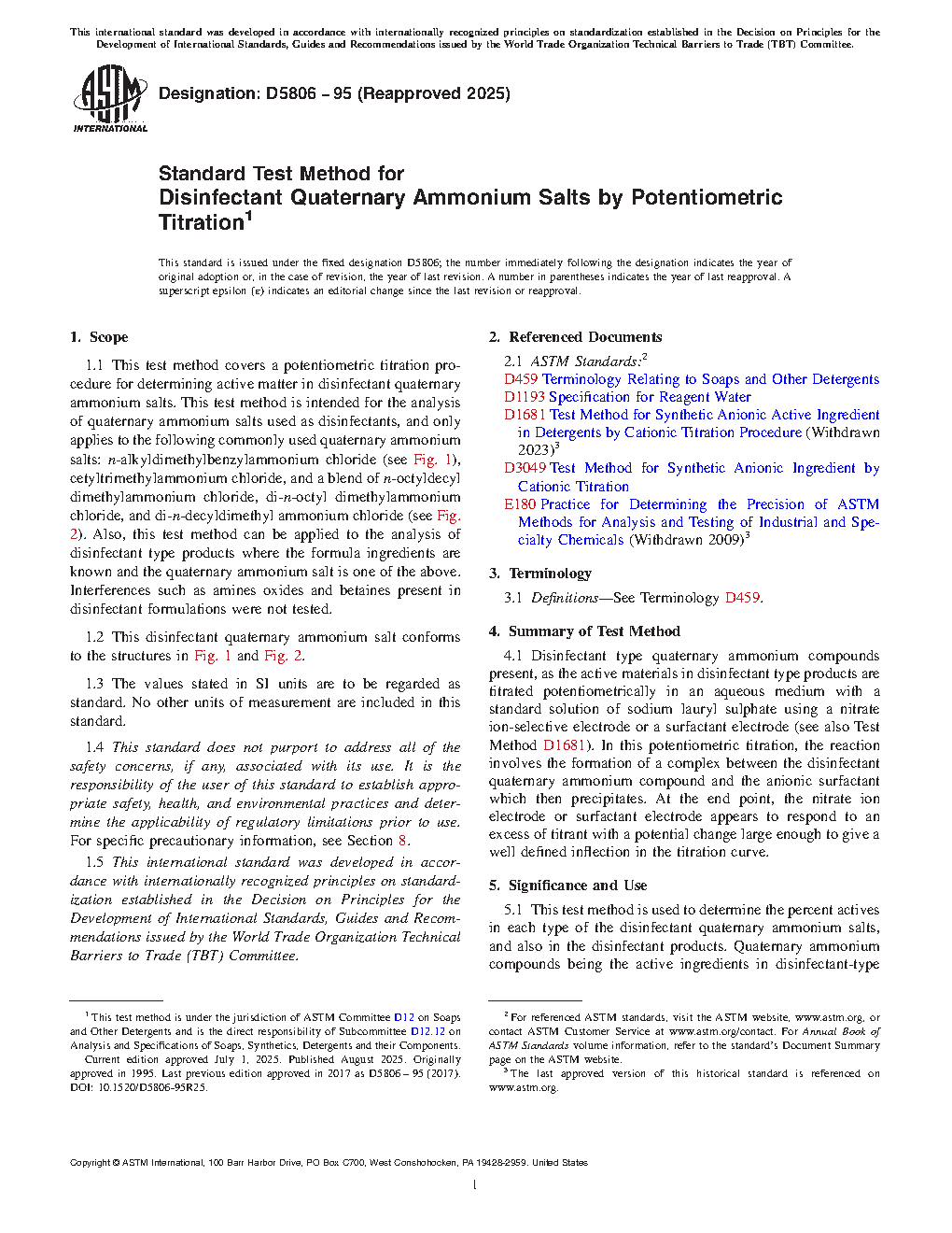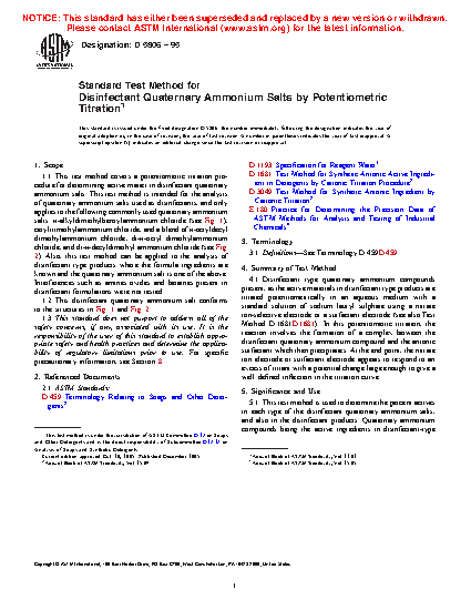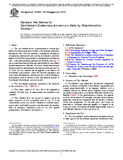 1.1 This test method covers a potentiometric titration procedure for determining active matter in disinfectant quaternary ammonium salts. This test method is intended for the analysis of quaternary ammonium salts used as disinfectants, and only applies to the following commonly used quaternary ammonium salts: -alkyldimethylbenzylammonium chloride (see Fig. 1), cetyltrimethylammonium chloride, and a blend of -octyldecyl dimethylammonium chloride, di- -octyl dimethylammonium chloride, and di -decyldimethyl ammonium chloride (see Fig. 2). Also, this test method can be applied to the analysis of disinfectant type products where the formula ingredients are known and the quaternary ammonium salt is one of the above. Interferences such as amines oxides and betaines present in disinfectant formulations were not tested.