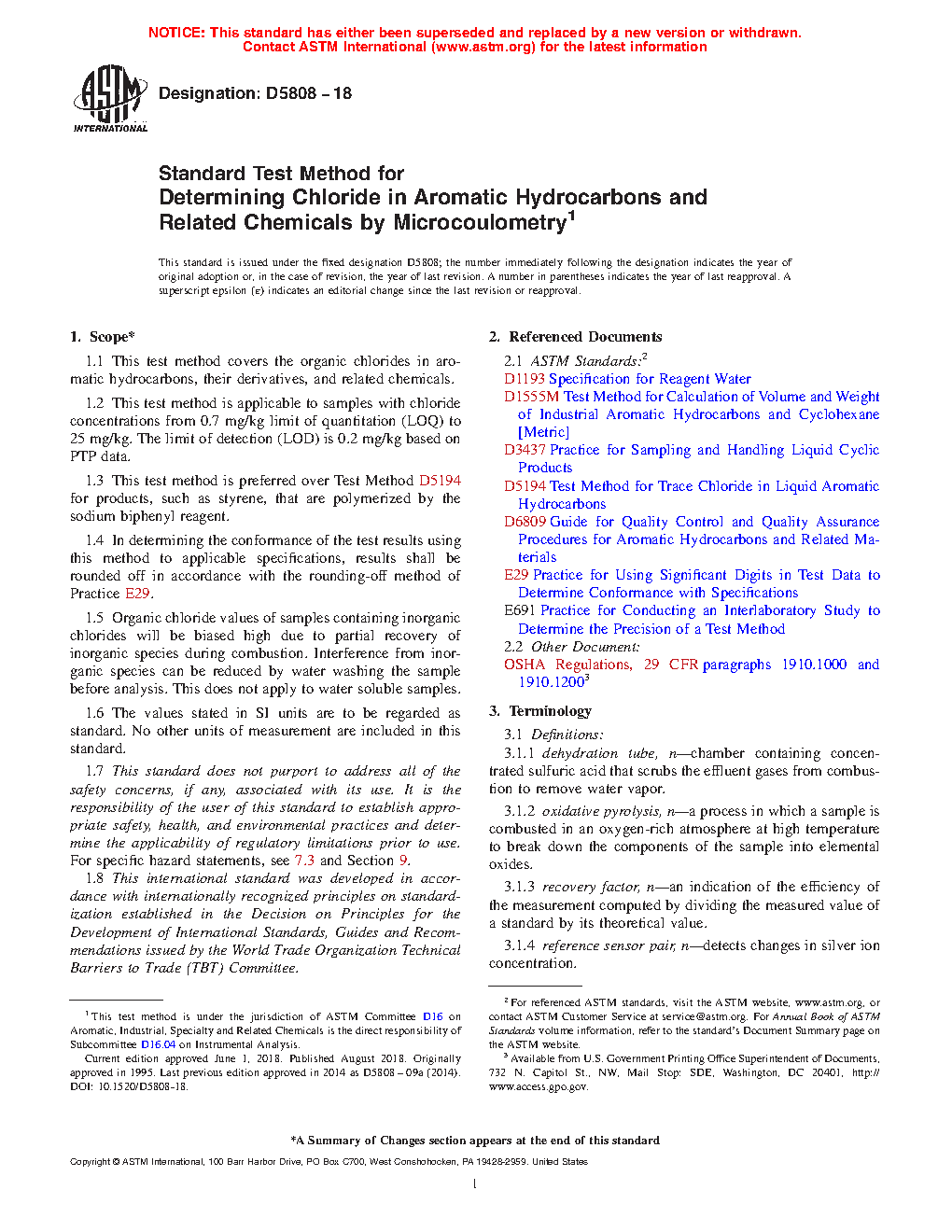 1.1 This test method covers the determination of organic chloride in aromatic hydrocarbons, their derivatives, and related chemicals.