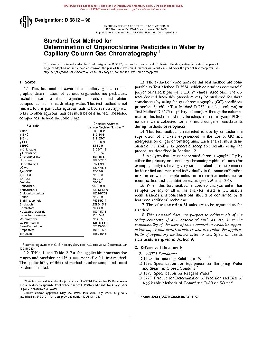 1.1 This test method covers the capillary gas chromatographic determination of various organochlorine pesticides, including some of their degradation products and related compounds in finished drinking water. This test method is not limited to this particular aqueous matrix; however, its applicability to other aqueous matrices must be determined. The tested compounds include the following: