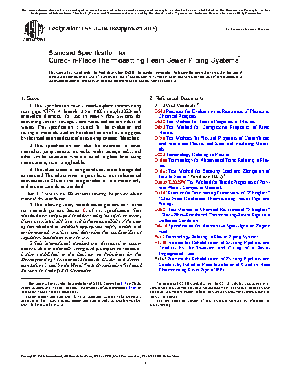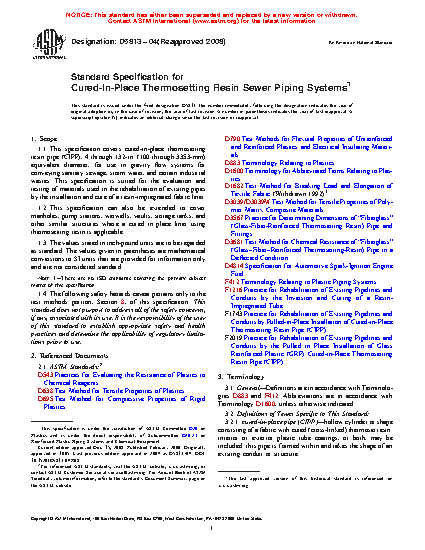 This specification covers cured-in-place thermosetting resin pipe (CIPP) with a certain measurement, equivalent diameter, for use in gravity flow systems in conveying sanitary sewage, storm water, and certain industrial wastes. This specification is suited for the evaluation and testing of materials used in the rehabilitation of existing pipes by the installation and cure of a resin-impregnated fabric liner. CIPP are classified into three types: Type I which is designed to provide chemical resistance and prevent exfiltration; Type II which is installed in a partially deteriorated existing pipe or structure and is designed to provide chemical resistance, prevent exfiltration and infiltration, and support the external hydrostatic loads due to groundwater only (and internal vacuum, where applicable), since the soil and live loads can be supported by the original conduit or structure; and Type III which is Installed in a fully deteriorated existing pipe or structure and designed to provide chemical resistance, prevent exfiltration and infiltration, and support all external hydraulic, soil, and live loads acting on the original conduit or structure. CIPP also are classified into three grades: Grade 1 as thermosetting polyester resin, Grade 2 as thermosetting polyester resin, and Grade 3 as thermosetting epoxy resin. Properties of CIPP materials such as diameter, wall thickness, chemical resistance, flexural strength, and tensile strength shall be determined by subjecting them to different tests.